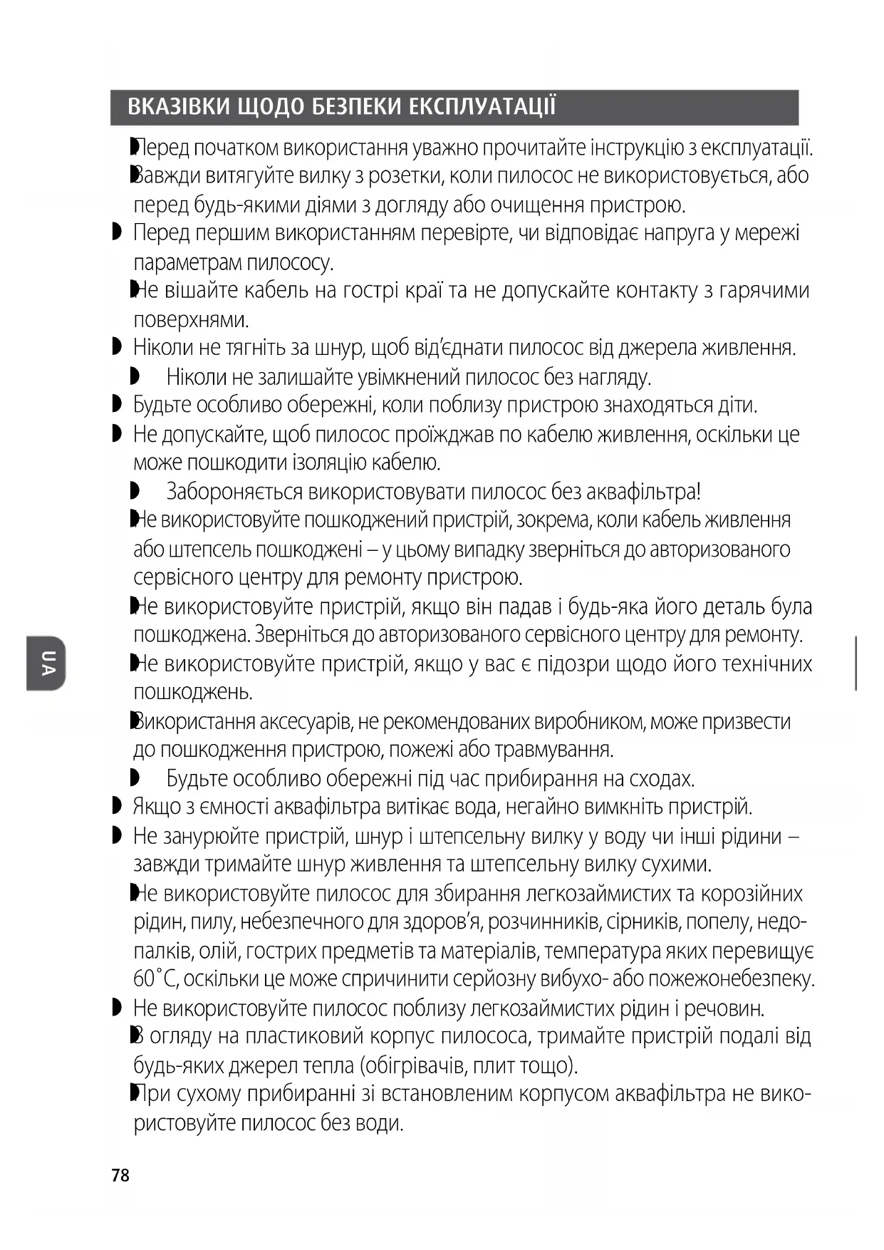 При сухому прибиранні зі встановленим корпусом аквафільтра не вико- ристовуйте пилосос без води.79