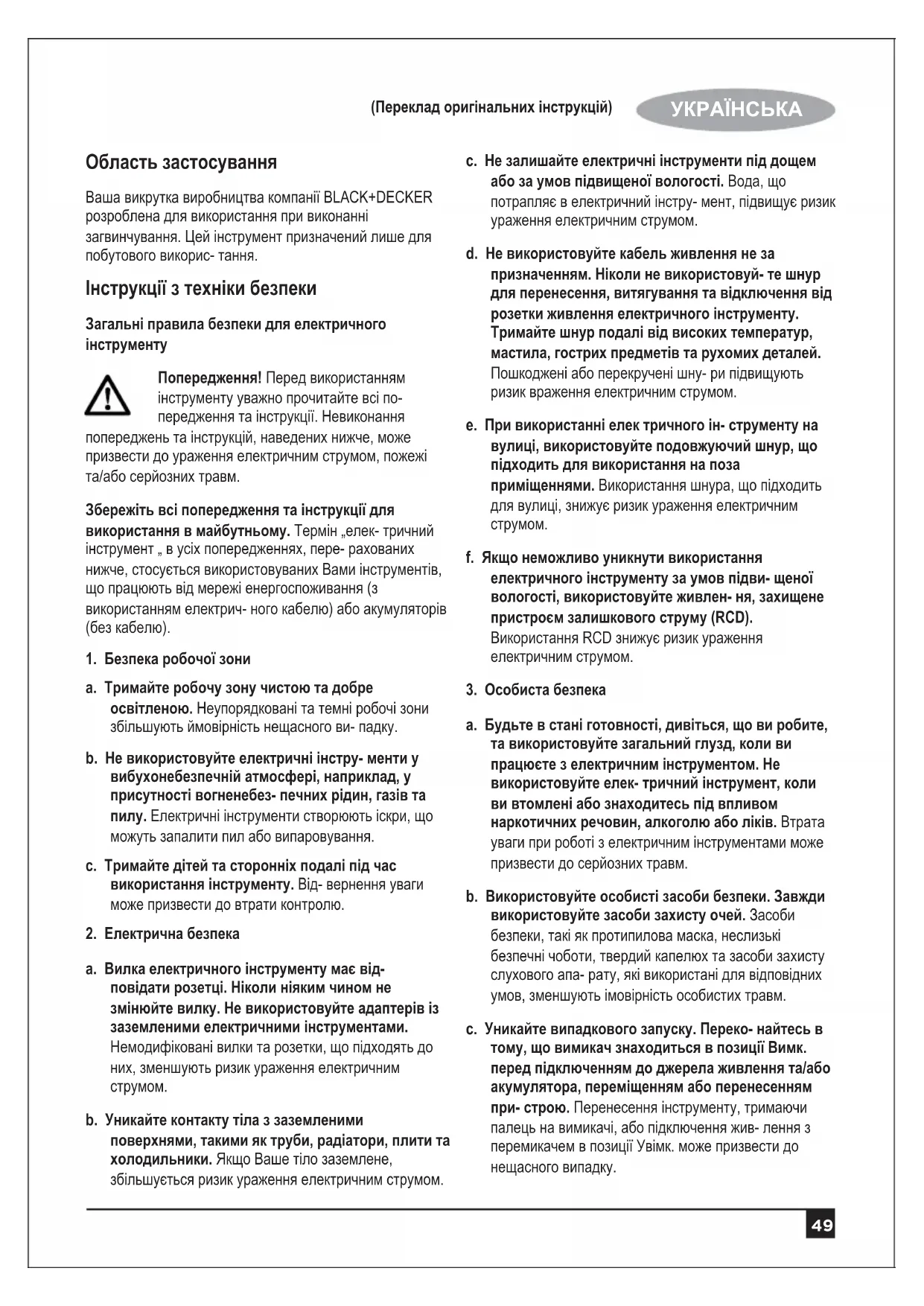 - Yetkili tamir servisleri veya Black + Decker servis ekibinden başkası tarafından tamir edilmeye çalışılmışsa. Garanti talebinde bulunmak için, satıcıya veya yetkili tamir servisine satın aldığınıza dair ispat sunmalısınız. Fatura ve garanti kartı gerekmektedir. Bu kılavuzda belirtilen listeden size en yakın BLACK+DECKER yetkili tamir servisinin yerini öğrenebilirsiniz. Ya da, alternatif olarak internet’ten BLACK+DECKER yetkili tamir servislerinin listesini ve satış sonrası hizmetlerimizle ilgili tüm bilgiler ve temas bilgilerine aşağıdaki siteden ulaşabilirsiniz. www.2helpU.com49 Область застосування Ваша викрутка виробництва компанії BLACK+DECKER розроблена для використання при виконанні загвинчування. Цей інструмент призначений лише для побутового викорис- тання. Інструкції з техніки безпеки Загальні правила безпеки для електричного інструменту Попередження! Перед використанням інструменту уважно прочитайте всі по- передження та інструкції. Невиконання попереджень та інструкцій, наведених нижче, може призвести до ураження електричним струмом, пожежі та/або серйозних травм. Збережіть всі попередження та інструкції для використання в майбутньому. Термін „елек- тричний інструмент „ в усіх попередженнях, пере- рахованих нижче, стосується використовуваних Вами інструментів, що працюють від мережі енергоспоживання (з використанням електрич- ного кабелю) або акумуляторів (без кабелю).