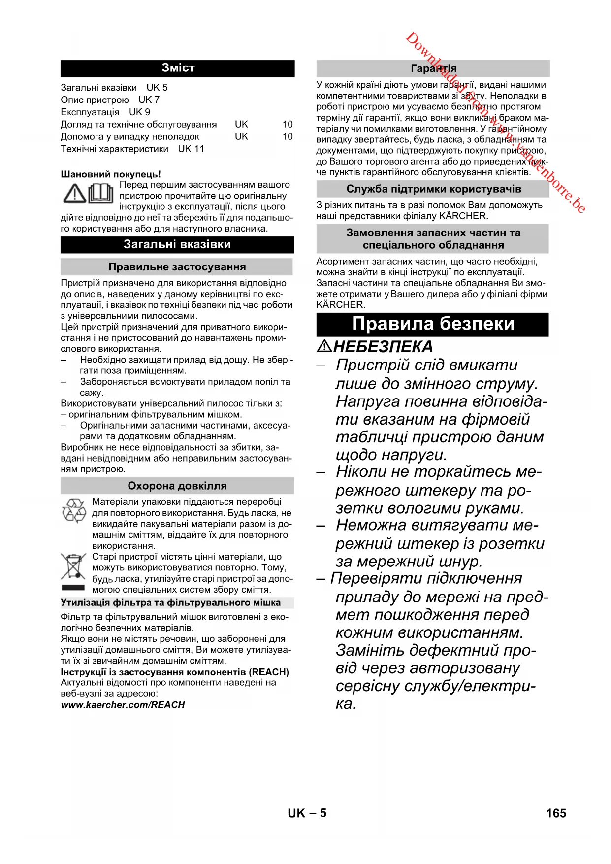 Служба підтримки користувачів Замовлення запасних частин та спеціального обладнання Правила безпеки 165UK Downloaded from www.vandenborre.be– 6 – Щоб уникнути нещасних випадків під час викори- стання електроприладів, ми рекомендуємо викори- стовувати розетки з по- передньо увімкненим авто- матом захисту від току витоку (макс. 30 мА сили току номінальної дії). – Під час проведення будь- яких робіт з догляду та технічного обслуговуван- ня апарат слід вимкнути, а мережевий шнур - витягти