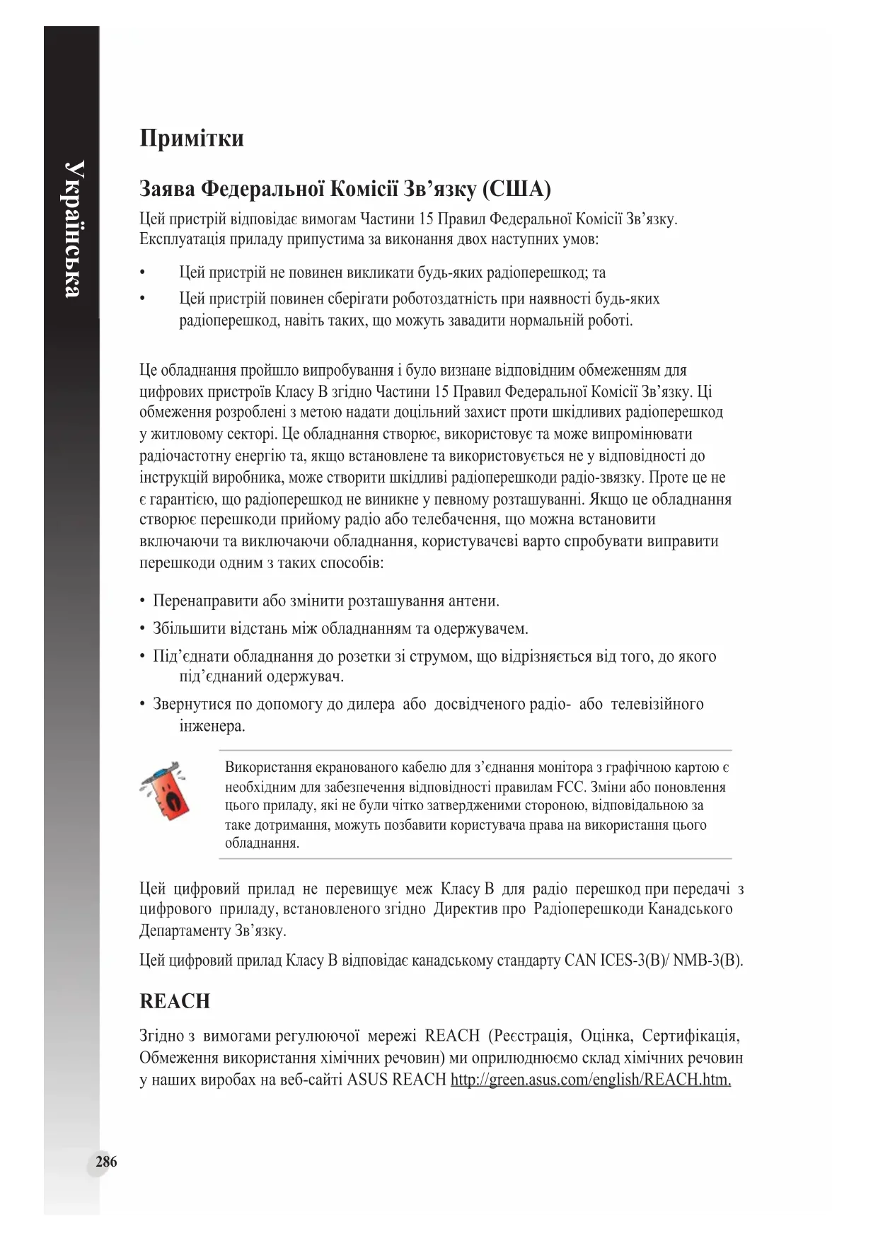 Цей цифровий прилад не перевищує меж Класу В для радіо перешкод при передачі з цифрового приладу, встановленого згідно Директив про Радіоперешкоди Канадського Департаменту Зв’язку. Цей цифровий прилад Класу В відповідає канадському стандарту CAN ICES-3(B)/ NMB-3(B). REACH Згідно з вимогами регулюючої мережі REACH (Реєстрація, Оцінка, Сертифікація, Обмеження використання хімічних речовин) ми оприлюднюємо склад хімічних речовин у наших виробах на веб-сайті ASUS REACH http://green.asus.com/english/REACH.htm.287