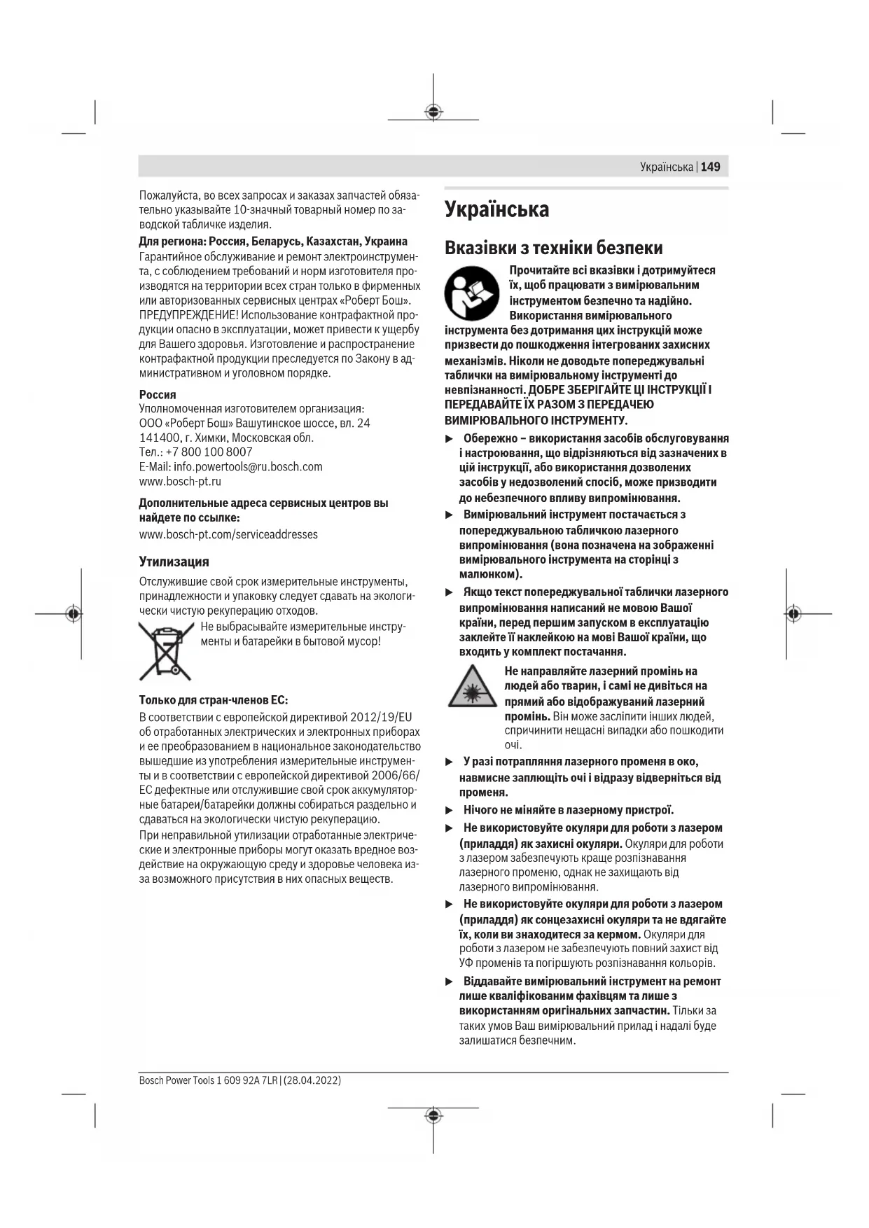 Витирайте забруднення вологою м’якою ганчіркою. Не використовуйте жодних миючих засобів або розчинників. Зокрема, регулярно прочищайте поверхні коло вихідного отвору лазера і слідкуйте при цьому за тим, щоб не залишалося ворсинок. Зберігайте і переносьте вимірювальний інструмент лише в доданій захисній сумці(28) або у футлярі(26). Надсилайте вимірювальний інструмент на ремонт у захисній сумці (28) або у футлярі(26). Сервіс і консультації з питань застосування В сервісній майстерні Ви отримаєте відповідь на Ваші запитання стосовно ремонту і технічного обслуговування Вашого продукту. Малюнки в деталях і інформацію щодо запчастин можна знайти за адресою: www.bosch-pt.com Команда співробітників Bosch з надання консультацій щодо використання продукції із задоволенням відповість на Ваші запитання стосовно нашої продукції та приладдя