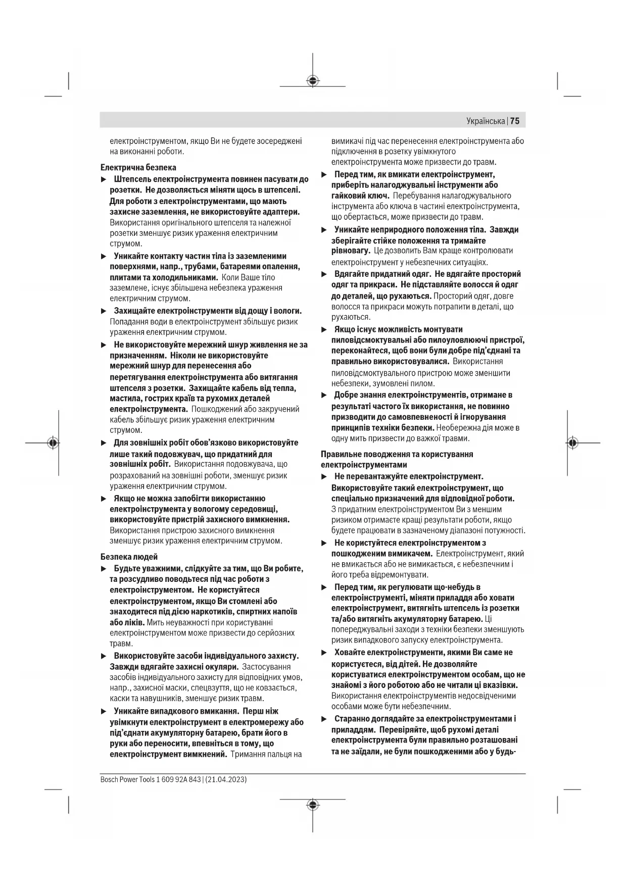 u Якщо існує можливість монтувати пиловідсмоктувальні або пилоуловлюючі пристрої, переконайтеся, щоб вони були добре під’єднані та правильно використовувалися. Використання пиловідсмоктувального пристрою може зменшити небезпеки, зумовлені пилом. u Добре знання електроінструментів, отримане в результаті частого їх використання, не повинно призводити до самовпевненості й ігнорування принципів техніки безпеки. Необережна дія може в одну мить призвести до важкої травми. Правильне поводження та користування електроінструментами u Не перевантажуйте електроінструмент. Використовуйте такий електроінструмент, що спеціально призначений для відповідної роботи. Зпридатним електроінструментом Ви з меншим ризиком отримаєте кращі результати роботи, якщо будете працювати в зазначеному діапазоні потужності. u Не користуйтеся електроінструментом з пошкодженим вимикачем. Електроінструмент, який не вмикається або не вимикається, є небезпечним і його треба відремонтувати. u Перед тим, як регулювати що-небудь в електроінструменті, міняти приладдя або ховати електроінструмент, витягніть штепсель із розетки та/або витягніть акумуляторну батарею. Ці попереджувальні заходи з техніки безпеки зменшують ризик випадкового запуску електроінструмента. u Ховайте електроінструменти, якими Ви саме не користуєтеся, від дітей. Не дозволяйте користуватися електроінструментом особам, що не знайомі з його роботою або не читали ці вказівки. Використання електроінструментів недосвідченими особами може бути небезпечним. u Старанно доглядайте за електроінструментами і приладдям. Перевіряйте, щоб рухомі деталі електроінструмента були правильно розташовані та не заїдали, не були пошкодженими або у будь- Bosch Power Tools 1 609 92A 843 | (21.04.2023)76 | Українська якому іншому стані, який міг би вплинути на функціонування електроінструмента. Пошкоджені електроінструменти потрібно відремонтувати, перш ніж користуватися ними знову. Велика кількість нещасних випадків спричиняється поганим доглядом за електроінструментами. u Тримайте різальні інструменти нагостреними та в чистоті. Старанно доглянуті різальні інструменти з гострим різальним краєм менше застряють та легші в експлуатації. u Використовуйте електроінструмент, приладдя до нього, робочі інструменти тощо відповідно до цих вказівок. Беріть до уваги при цьому умови роботи та специфіку виконуваної роботи. Використання електроінструментів для робіт, для яких вони не передбачені, може призвести до небезпечних