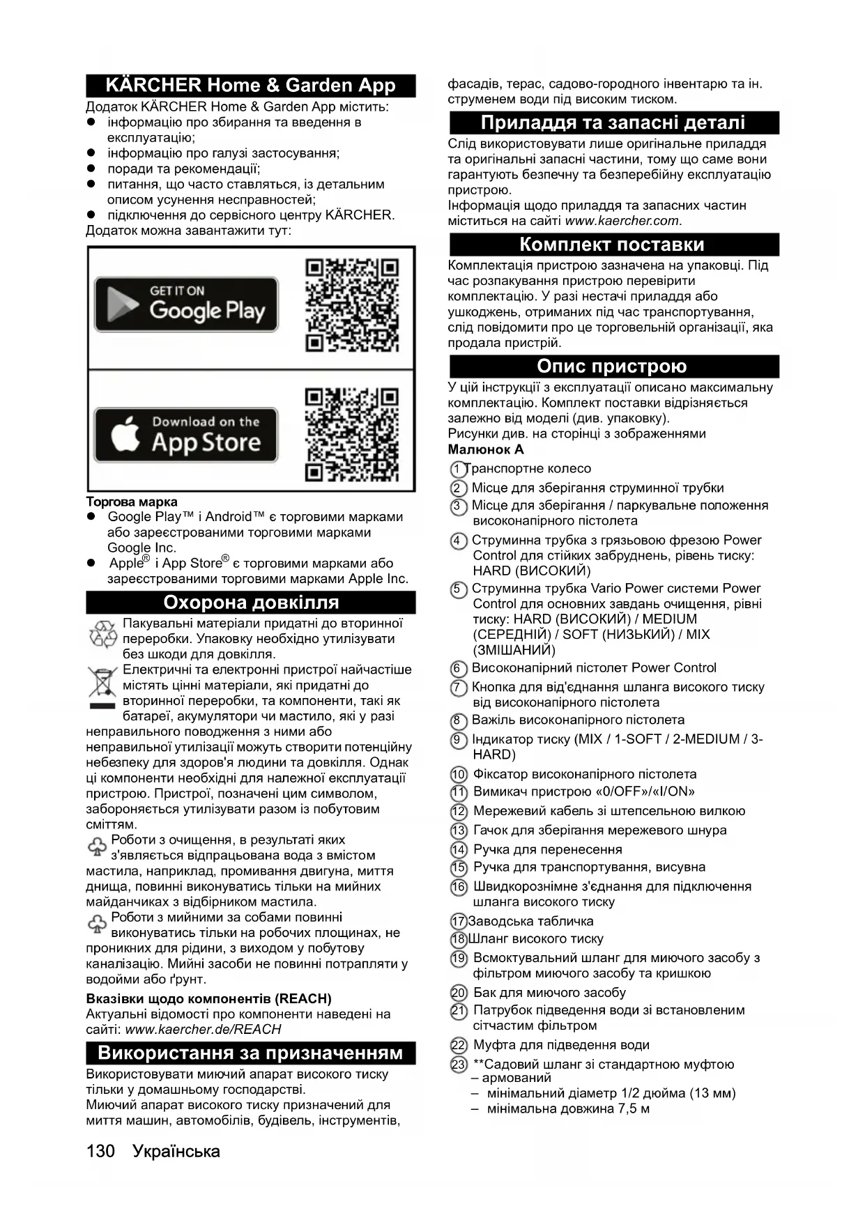 Chairman of the Board of Management Director Regulatory Affairs & Certification H. Jenner S. Reiser130 Українська KÄRCHER Home & Garden App Додаток KÄRCHER Home & Garden App містить: інформацію про збирання та введення в експлуатацію; інформацію про галузі застосування; поради та рекомендації; питання, що часто ставляться, із детальним описом усунення несправностей; підключення до сервісного центру KÄRCHER. Додаток можна завантажити тут: Торгова марка Google Play™ і Android™ є торговими марками або зареєстрованими торговими марками Google Inc. Apple