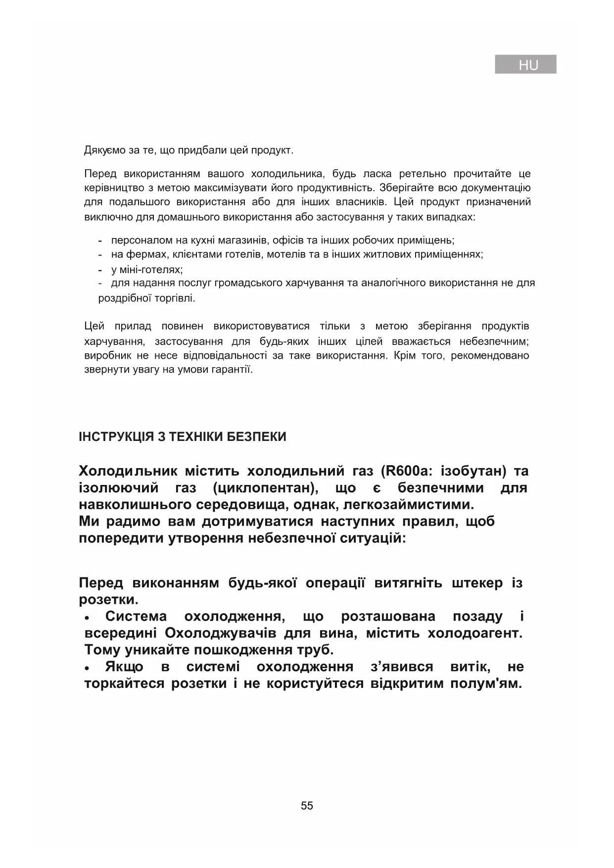 Ö verensstä mmelse 51525354Дяку ємо за те, що придбали цей продукт. Перед використанням вашого холодильника, будь ласка ретельно прочитайте це керівництво з метою максимізувати його продуктивність. Зберігайте всю документацію для подальшого використання або для інших власників. Цей продукт призначений виключно для домашнього використання або застосування у таких випадках: - персоналом на кухні магазинів, офісів та інших робочих приміщень; - на фермах, клієнтами готелів, мотелів та в інших житлових приміщеннях; - у міні-готелях; - для надання послуг громадського харчування та аналогічного використання не для роздрібної торгівлі. Цей прилад повинен використовуватися тільки з метою зберігання продуктів харчування, застосування для будь-яких інших цілей вважається небезпечним; виробник не несе відповідальності за таке використання. Крім того, рекомендовано звернути увагу на умови гарантії. ІНСТРУКЦІЯ З ТЕХНІКИ БЕЗПЕКИ