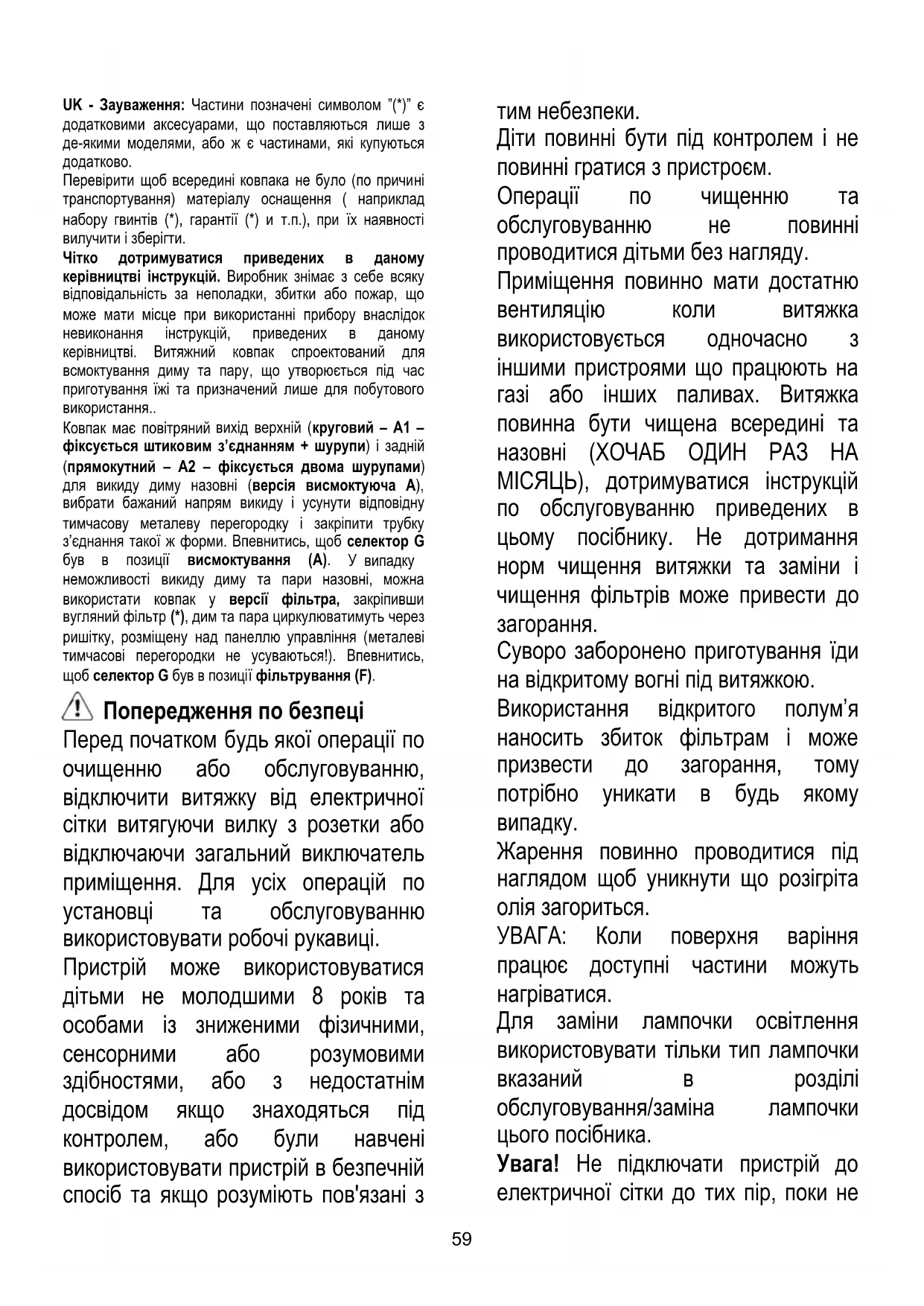 неможливості викиду диму та пари назовні, можна використати ковпак у версії фільтра, закріпивши вугляний фільтр (*), дим та пара циркулюватимуть через ришітку, розміщену над панеллю управління (металеві тимчасові перегородки не усуваються!). Впевнитись, щоб селектор G був в позиції фільтрування (F). Попередження по безпеці Перед початком будь якої операції по очищенню або обслуговуванню, відключити витяжку від електричної сітки витягуючи вилку з розетки або відключаючи загальний виключатель приміщення. Для усіх операцій по установці та обслуговуванню використовувати робочі рукавиці. Пристрій може використовуватися дітьми не молодшими 8 років та особами із зниженими фізичними, сенсорними або розумовими здібностями, або з недостатнім досвідом якщо знаходяться під контролем, або були навчені використовувати пристрій в безпечній спосіб та якщо розуміють пов'язані з тим небезпеки. Діти повинні бути під контролем і не повинні гратися з пристроєм. Операції по чищенню та обслуговуванню не повинні проводитися дітьми без нагляду. Приміщення повинно мати достатню вентиляцію коли витяжка використовується одночасно з іншими пристроями що працюють на газі або інших паливах. Витяжка повинна бути чищена всередині та назовні (ХОЧАБ ОДИН РАЗ НА МІСЯЦЬ), дотримуватися інструкцій по обслуговуванню приведених в цьому посібнику. Не дотримання норм чищення витяжки та заміни і чищення фільтрів може привести до
