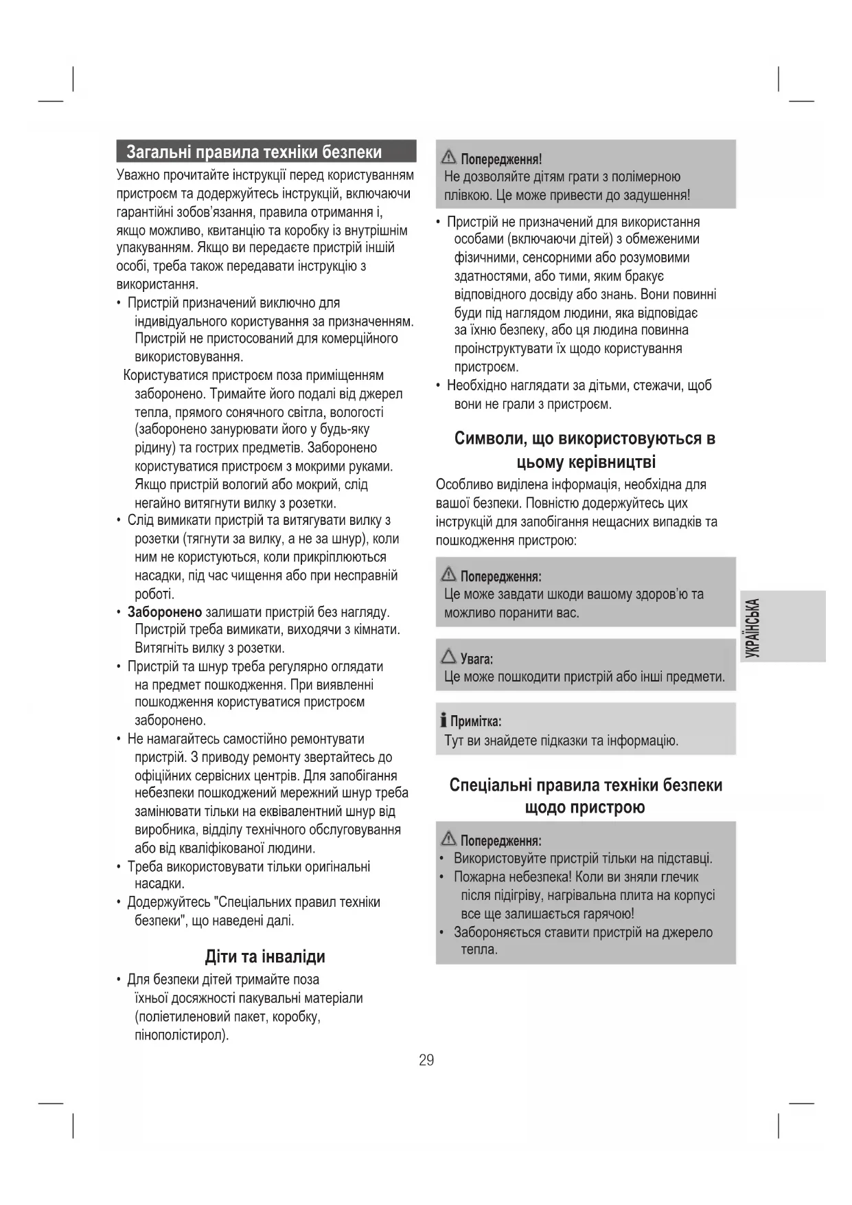 - Додержуйтесь "Спеціальних правил техніки безпеки", що наведені далі. Діти та інваліди