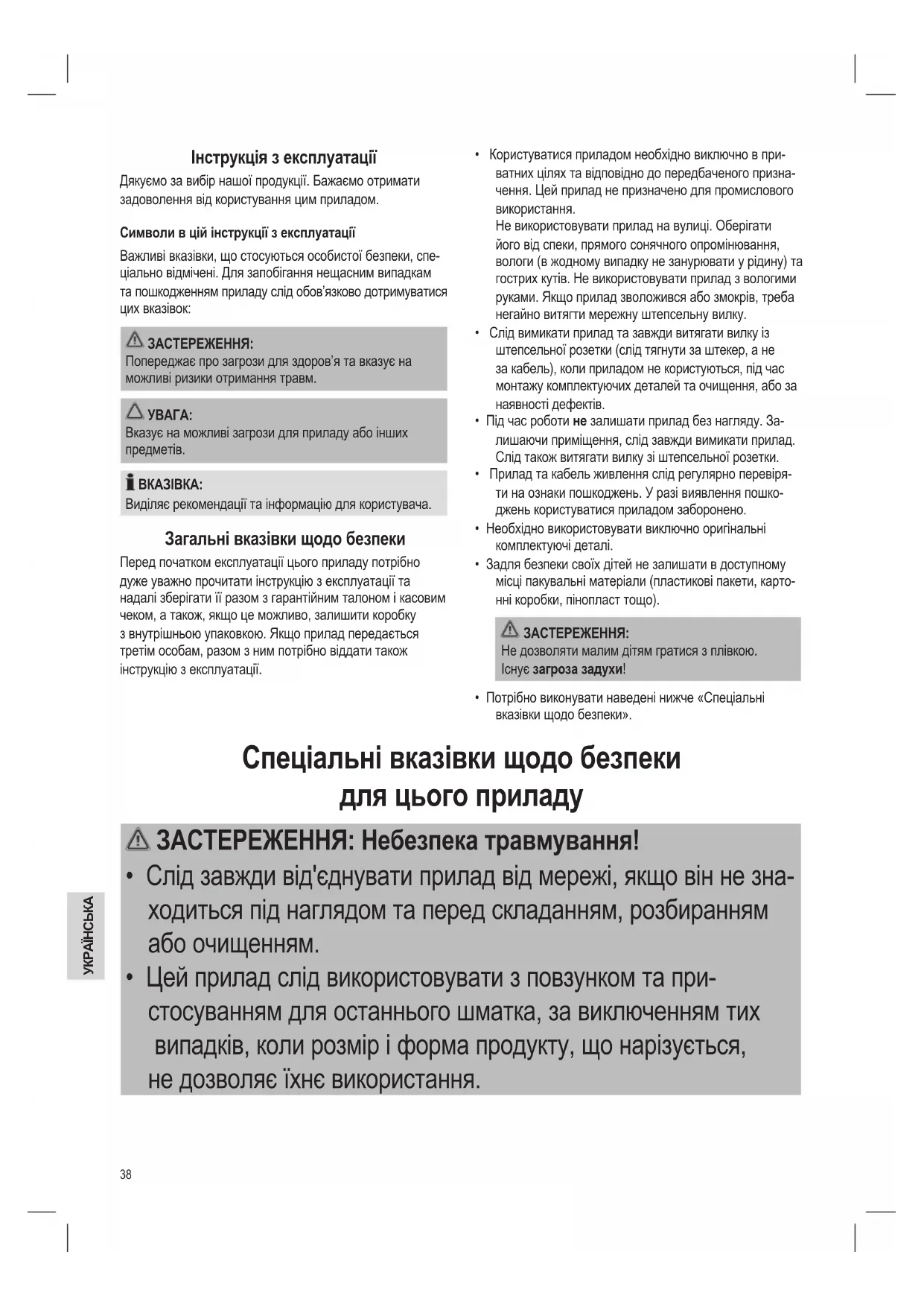 Виділяє рекомендації та інформацію для користувача. Загальні вказівки щодо безпеки Перед початком експлуатації цього приладу потрібно дуже уважно прочитати інструкцію з експлуатації та надалі зберігати її разом з гарантійним талоном і касовим чеком, а також, якщо це можливо, залишити коробку з внутрішньою упаковкою. Якщо прилад передається третім особам, разом з ним потрібно віддати також інструкцію з експлуатації.