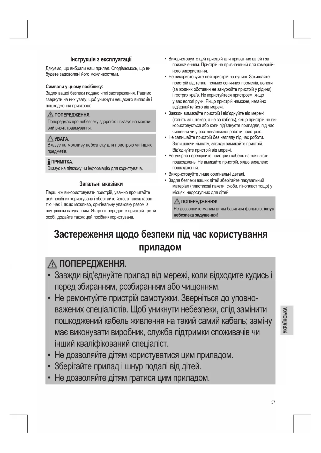 - Не дозволяйте дітям гратися цим приладом.38 ПОПЕРЕДЖЕННЯ.
