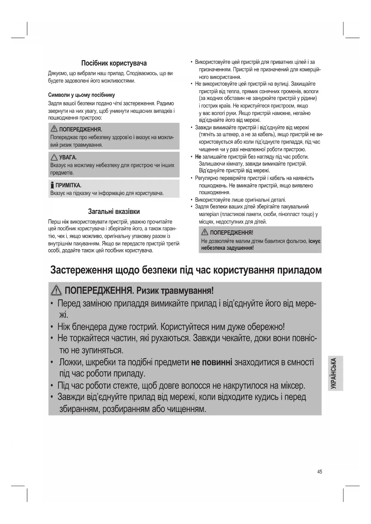 ПОПЕРЕДЖЕННЯ. Ризик травмування! Ніж блендера дуже гострий. Користуйтеся ним дуже обережно.