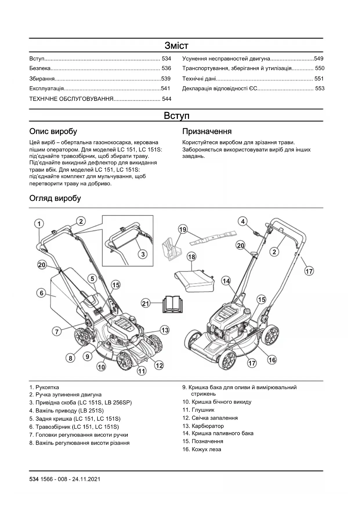 Опис виробу Цей виріб – обертальна газонокосарка, керована пішим оператором. Для моделей LC 151, LC 151S: під’єднайте травозбірник, щоб збирати траву. Під’єднайте викидний дефлектор для викидання трави вбік. Для моделей LC 151, LC 151S: під’єднайте комплект для мульчування, щоб перетворити траву на добриво. Призначення Користуйтеся виробом для зрізання трави. Забороняється використовувати виріб для інших