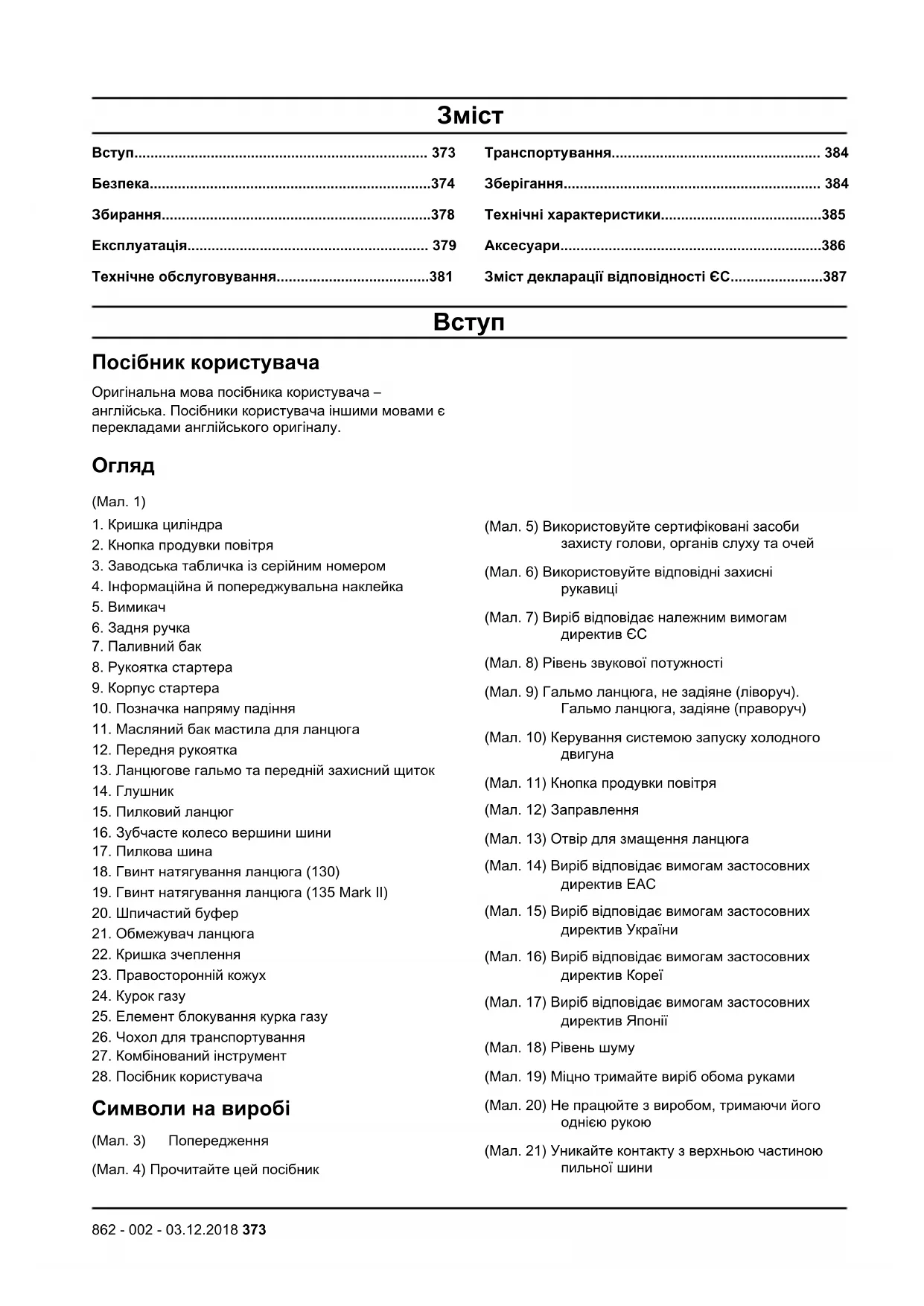 Символи на виробі (Мал. 3) Попередження (Мал. 4) Прочитайте цей посібник (Мал. 5) Використовуйте сертифіковані засоби захисту голови, органів слуху та очей (Мал. 6) Використовуйте відповідні захисні