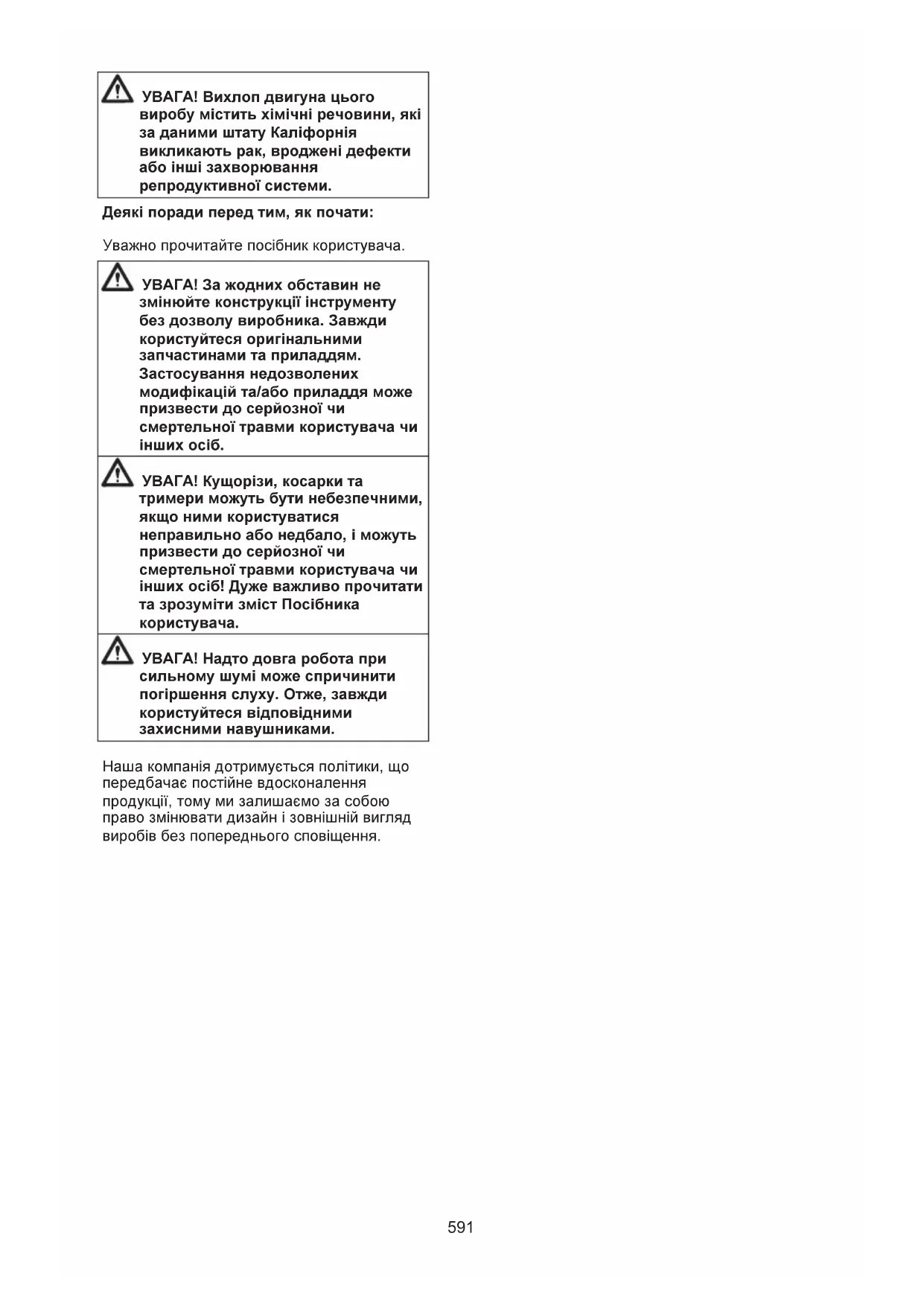 - Кущорізи, косарки та тримери можуть бути небезпечними, якщо ними користуватися неправильно або недбало, і можуть призвести до серйозної чи смертельної травми користувача чи інших осіб! Дуже важливо прочитати та зрозуміти зміст Посібника користувача.