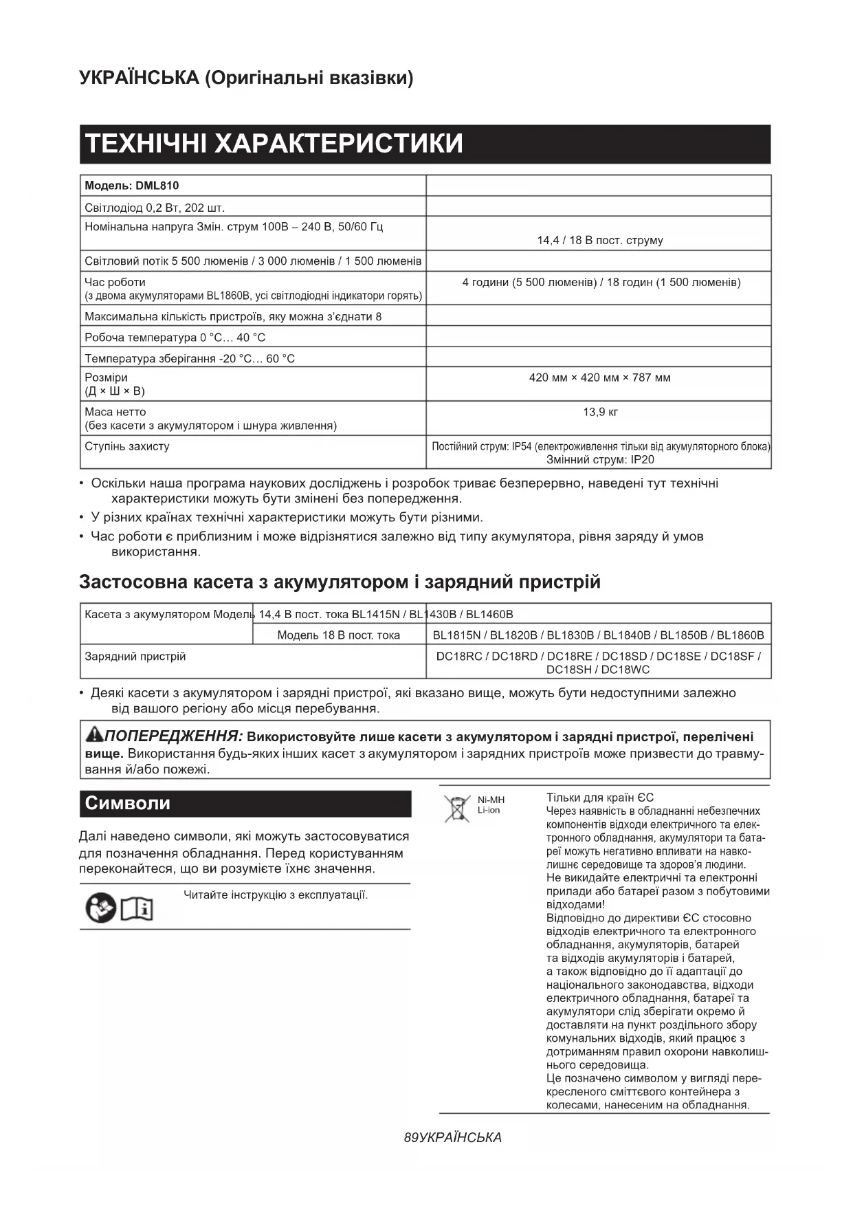 (з двома акумуляторами BL1860B, усі світлодіодні індикатори горять) 4 години (5 500 люменів) / 18 годин (1 500 люменів) Максимальна кількість пристроїв, яку можна з’єднати 8 Робоча температура 0 °C… 40 °C Температура зберігання -20 °C… 60 °C