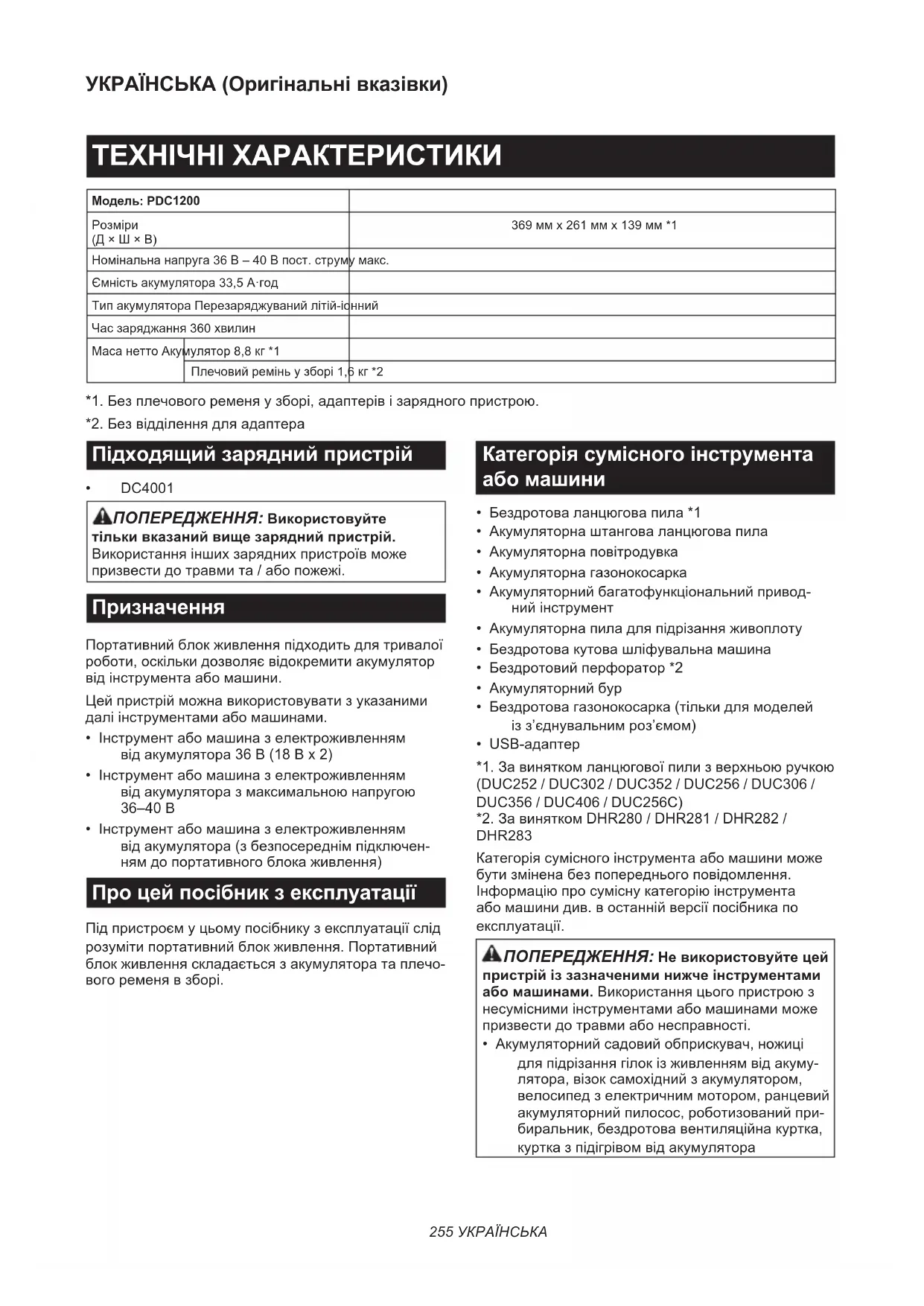 - DC4001 ПОПЕРЕДЖЕННЯ: Використовуйте тільки вказаний вище зарядний пристрій. Використання інших зарядних пристроїв може призвести до травми та / або пожежі. Призначення Портативний блок живлення підходить для тривалої роботи, оскільки дозволяє відокремити акумулятор від інструмента або машини. Цей пристрій можна використовувати з указаними далі інструментами або машинами.