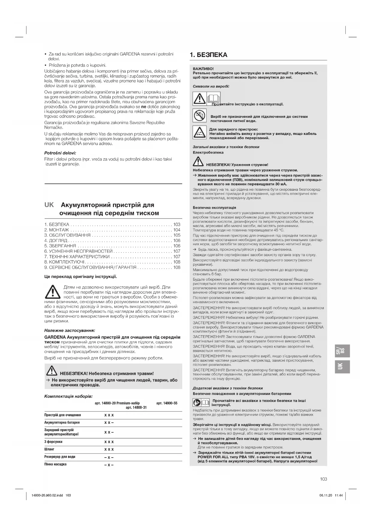 Це переклад оригіналу інструкції. Дітям не дозволено використовувати цей виріб. Діти повинні перебувати під наглядом дорослих для впевне- ності, що вони не граються з виробом. Особи з обмеже- ними фізичними, сенсорними або розумовими можливостями, або з відсутністю досвіду й знань, можуть використовувати даний виріб, якщо вони перебувають під наглядом або пройшли інструк- таж з безпечного використання виробу й розуміють пов’язані із цим ризики. Належне застосування: GARDENA Акумуляторний пристрій для очищення під середнім тиском призначений для очистки плитки для підлоги, садових меблів/ інструментів, велосипедів, автомобілів, човнів і ніжного очищення на присадибних і дачних ділянках. Виріб не призначений для безперервного режиму роботи. НЕБЕЗПЕКА! Небезпека отримання травми! v Не використовуйте виріб для чищення людей, тварин, або електричних проводів. Комплектація наборів: арт. 14800-20 Premium-набір арт. 14800-31 арт. 14800-55 Пристрій для очищення x x x Акумуляторна батарея x x – Зарядний пристрій акумуляторної батареї x x – 3 форсунки x x x