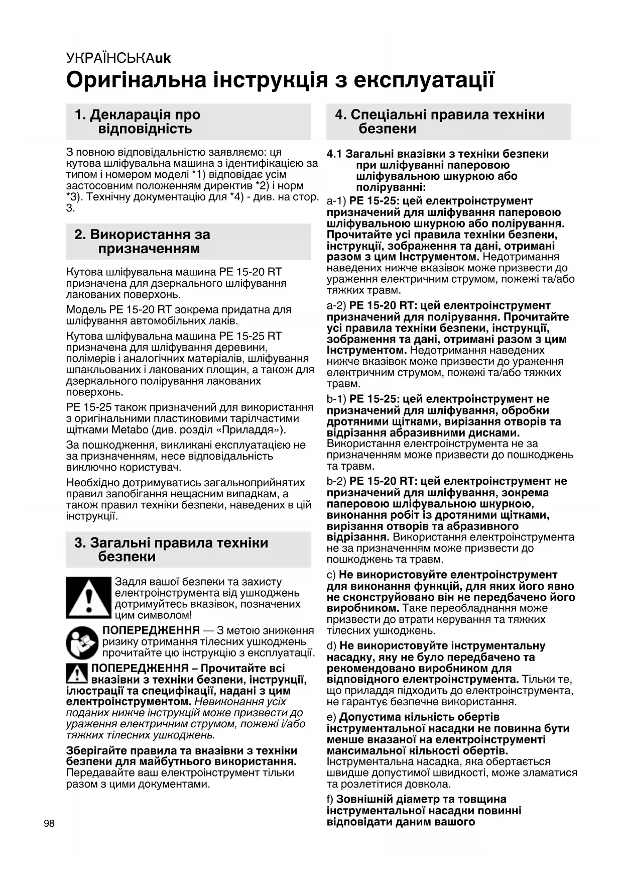 PE 15-25 також призначений для використання з оригінальними пластиковими тарілчастими щітками Metabo (див. розділ «Приладдя»). За пошкодження, викликані експлуатацією не за призначенням, несе відповідальність виключно користувач. Необхідно дотримуватись загальноприйнятих правил запобігання нещасним випадкам, а також правил техніки безпеки, наведених в цій інструкції. Задля вашої безпеки та захисту електроінструмента від ушкоджень дотримуйтесь вказівок, позначених цим символом! ПОПЕРЕДЖЕННЯ — З метою зниження ризику отримання тілесних ушкоджень прочитайте цю інструкцію з експлуатації. ПОПЕРЕДЖЕННЯ – Прочитайте всі вказівки з техніки безпеки, інструкції, ілюстрації та специфікації, надані з цим електроінструментом. Невиконання усіх поданих нижче інструкцій може призвести до ураження електричним струмом, пожежі і/або тяжких тілесних ушкоджень. Зберігайте правила та вказівки з техніки безпеки для майбутнього використання. Передавайте ваш електроінструмент тільки разом з цими документами.