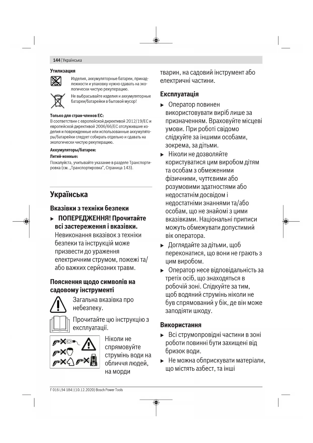 тварин, на садовий інструмент або електричні частини. Експлуатація u Оператор повинен використовувати виріб лише за призначенням. Враховуйте місцеві умови. При роботі свідомо слідкуйте за іншими особами, зокрема, за дітьми. u Ніколи не дозволяйте користуватися цим виробом дітям та особам з обмеженими фізичними, чуттєвими або розумовими здатностями або недостатнім досвідом і недостатніми знаннями та/або особам, що не знайомі з цими вказівками. Національні приписи можуть обмежувати допустимий вік оператора. u Доглядайте за дітьми, щоб переконатися, що вони не грають з цим виробом. u Оператор несе відповідальність за третіх осіб, що знаходяться в робочій зоні. Слідкуйте за тим, щоб водяний струмінь ніколи не був спрямований у бік, де він може заподіяти шкоду. Використання u Всі струмопровідні частини в зоні роботи повинні бути захищені від бризок води. u Не можна обприскувати матеріали, що містять азбест, та інші F 016 L94 184 | (10.12.2020) Bosch Power ToolsУкраїнська | 145 матеріали, що містять шкідливі для здоров’я речовини. u Оперуйте інструментом, лише коли відсік для акумуляторної батареї закритий. Це захищає акумуляторну батарею від бризок