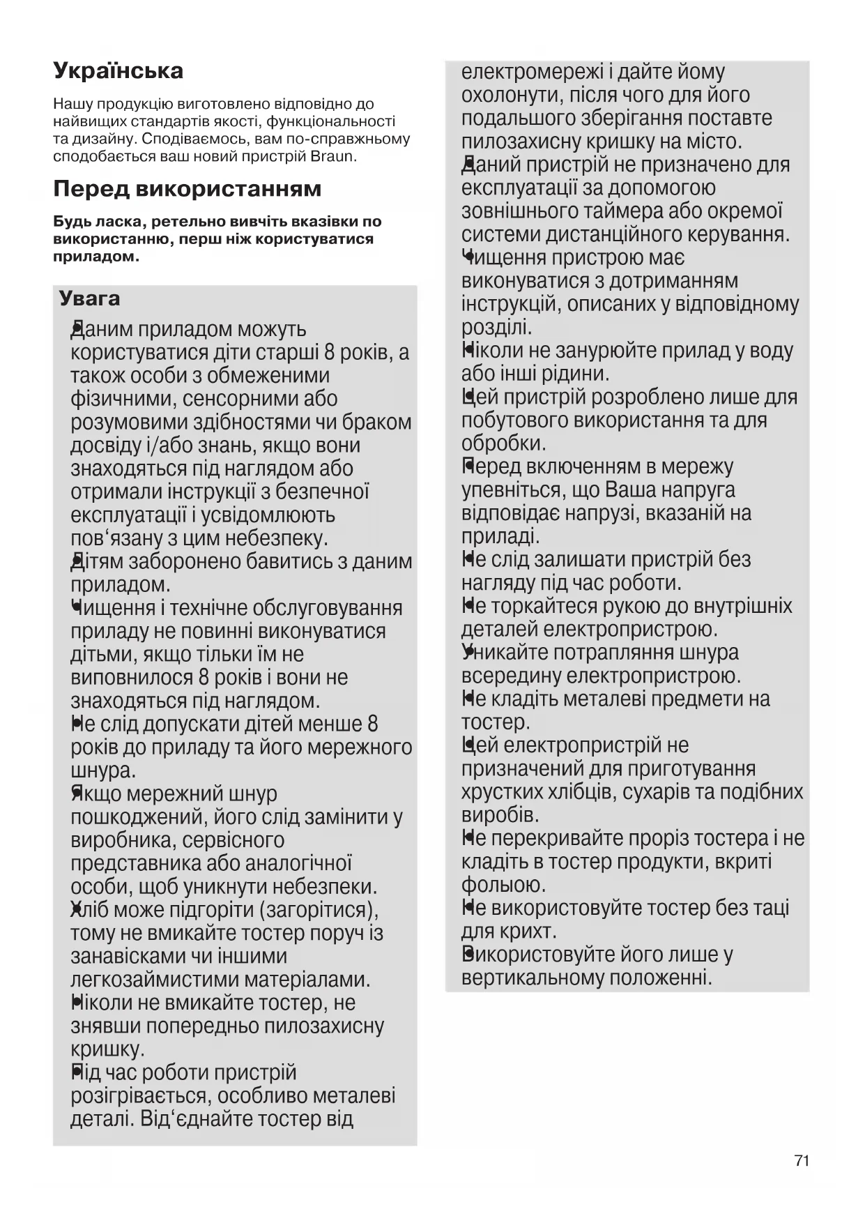 Примітка: Не використовуйте цю функцію для тортів, піци, хлібопекарських форм і цілих буханок хліба. Це призведе до перегріву внутрішньої частини тостера. Булки не повинні бути загорнуті у фольгу. Кришка для захисту від пилу (лише в окремих моделях) Кришка для захисту від пилу призначена для блокування отворів для тостів, коли тостер не використовується, і забезпечує чистоту під час зберігання і використання. Примітка: Не використовуйте кришку для захисту від пилу під час експлуатації. 72Інструкція може бути змінена без попереднього повідомлення. Будь ласка, не утилізуйте прилад разом із побутовими відходами наприкінці терміну його експлуатації. Здати прилад на утилізацію можна в Сервісному центрі Braun або у відповідних пунктах збору, передбачених у вашій країні. Посібник із пошуку та усунення несправностей Проблема Причина Вирішення Хліб вискакує практично відразу ж, не встигнувши підсмажитися Піддон для крихт знаходиться в неправильному положенні Важіль підйому хліба знаходиться в неправильному положенні Переконайтеся в тому, що піддон для крихт знаходиться в правильному