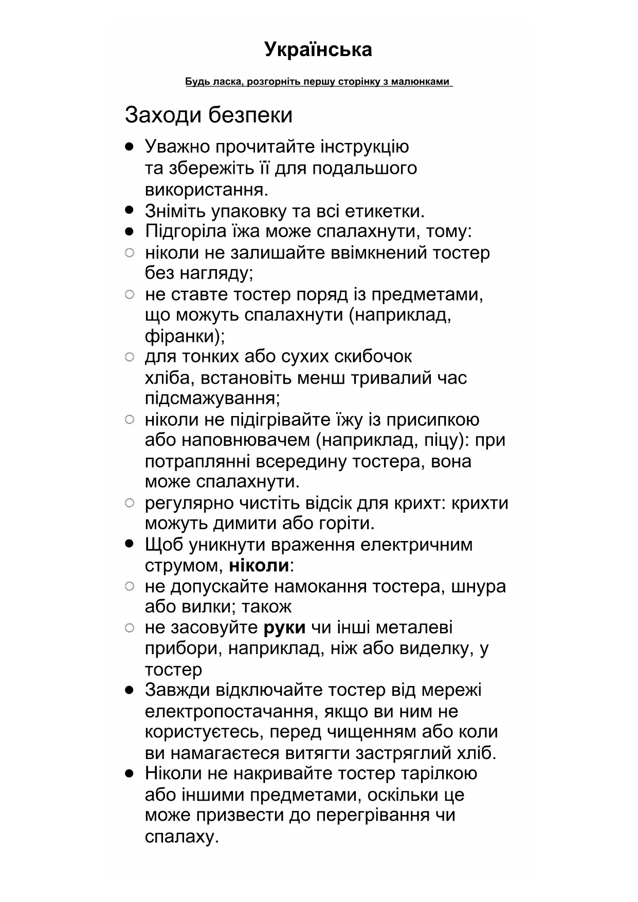 Підгоріла їжа може спалахнути, тому: ніколи не залишайте ввімкнений тостер без нагляду; не ставте тостер поряд із предметами, що можуть спалахнути (наприклад,