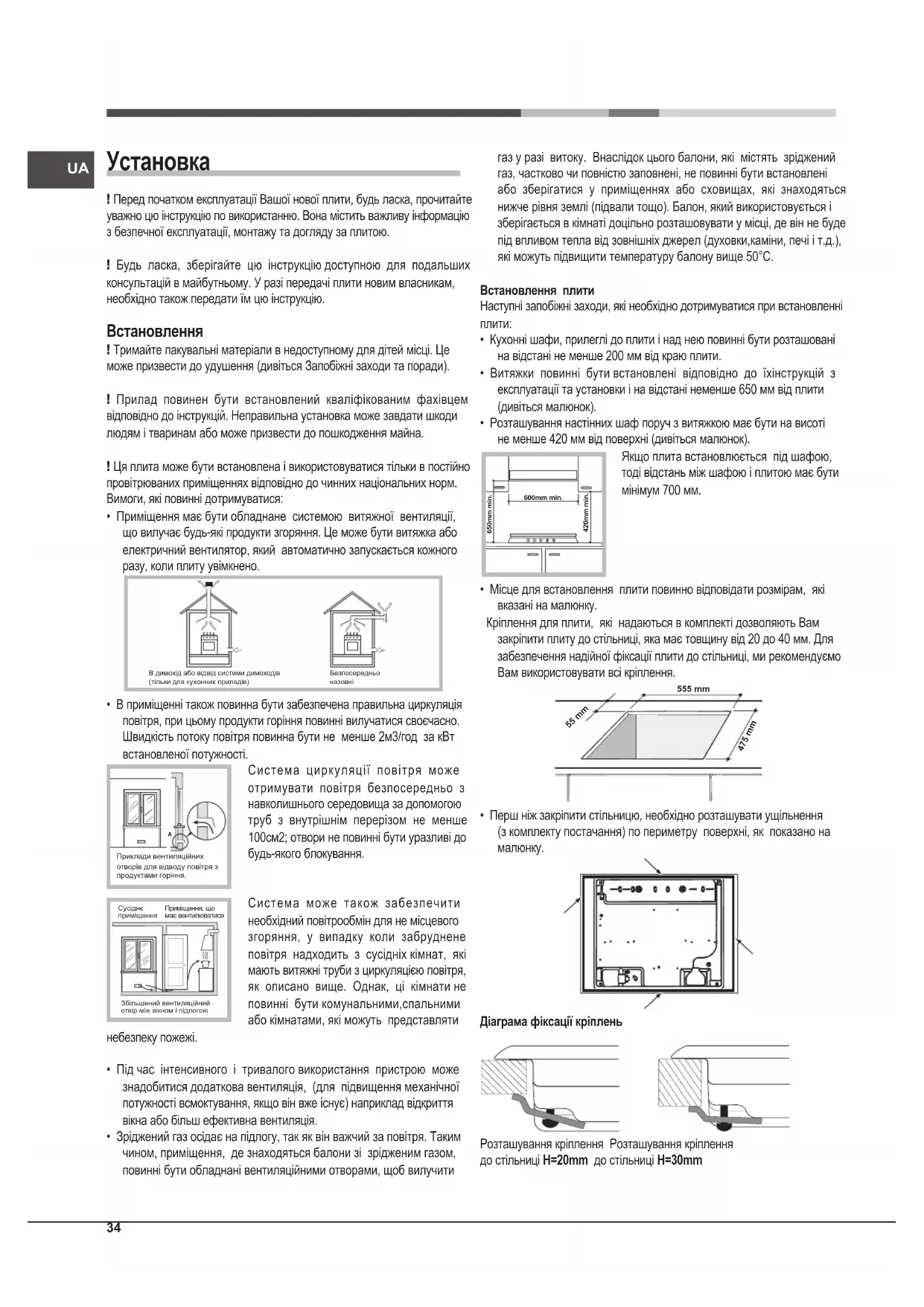 ! Перед початком експлуатації Вашої нової плити, будь ласка, прочитайте уважно цю інструкцію по використанню. Вона містить важливу інформацію з безпечної експлуатації, монтажу та догляду за плитою. ! Будь ласка, зберігайте цю інструкцію доступною для подальших консультацій в майбутньому. У разі передачі плити новим власникам, необхідно також передати їм цю інструкцію. Встановлення ! Тримайте пакувальні матеріали в недоступному для дітей місці. Це може призвести до удушення (дивіться Запобіжні заходи та поради). ! Прилад повинен бути встановлений кваліфікованим фахівцем відповідно до інструкцій. Неправильна установка може завдати шкоди людям і тваринам або може призвести до пошкодження майна. ! Ця плита може бути встановлена і використовуватися тільки в постійно провітрюваних приміщеннях відповідно до чинних національних норм. Вимоги, які повинні дотримуватися: