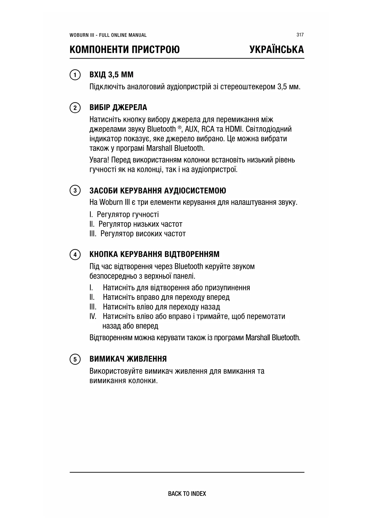 ВХІД ЖИВЛЕННЯ Використовуйте комплектний кабель живлення для підключення Woburn III до розетки. КОМПОНЕНТИ ПРИСТРОЮ УКРАЇНСЬКА319
