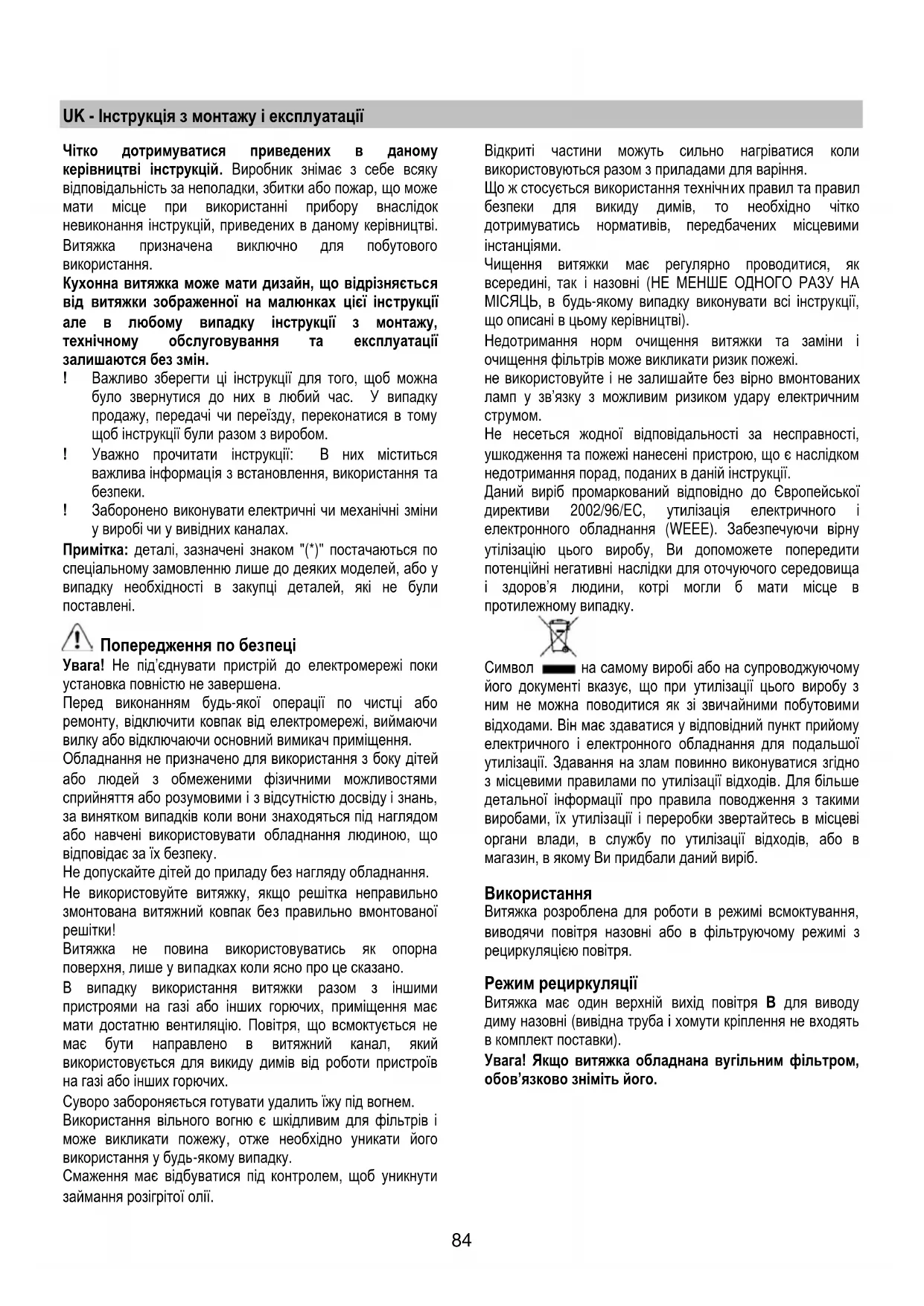 детальної інформації про правила поводження з такими виробами, їх утилізації і переробки звертайтесь в місцеві органи влади, в службу по утилізації відходів, або в магазин, в якому Ви придбали даний виріб. Використання Витяжка розроблена для роботи в режимі всмоктування, виводячи повітря назовні або в фільтруючому режимі з рециркуляцією повітря. Режим рециркуляції Витяжка має один верхній вихід повітря В для виводу диму назовні (вивідна труба і хомути кріплення не входять в комплект поставки). Увага! Якщо витяжка обладнана вугiльним фiльтром, обов’язково знiмiть його.85 Фільтруючий тип Якщо вивід диму і пару на зовню неможливо, ви можете користуватися ковпаком в фільтруючому режимі, встановлюючи вугільний фільтр і дефлектор F на кронштейні G. Таким чином очищене від димових парів повітря повертається в приміщення через верхню решітку H і вивідну трубу, під’єднану до верхнього вивідного отвору B за допомогою з’єднуючого кільця, встановленого на дефлекторі F (вивідна труба і хомути кріплення не входять в комплект поставки). Увага! Якщо витяжка не об ладнана вугiльним фiльтром, замовте та встановiть його перед використанням. Моделі ковпаків без моторного блоку можуть працювати лише в одному режимі відводу повітря назовні, тому повинні бути під’єднані до зовн ішньої витяжної установки (не входить в поставку). Інструкції щодо під'єднання постачаються з периферійним обладнанням.