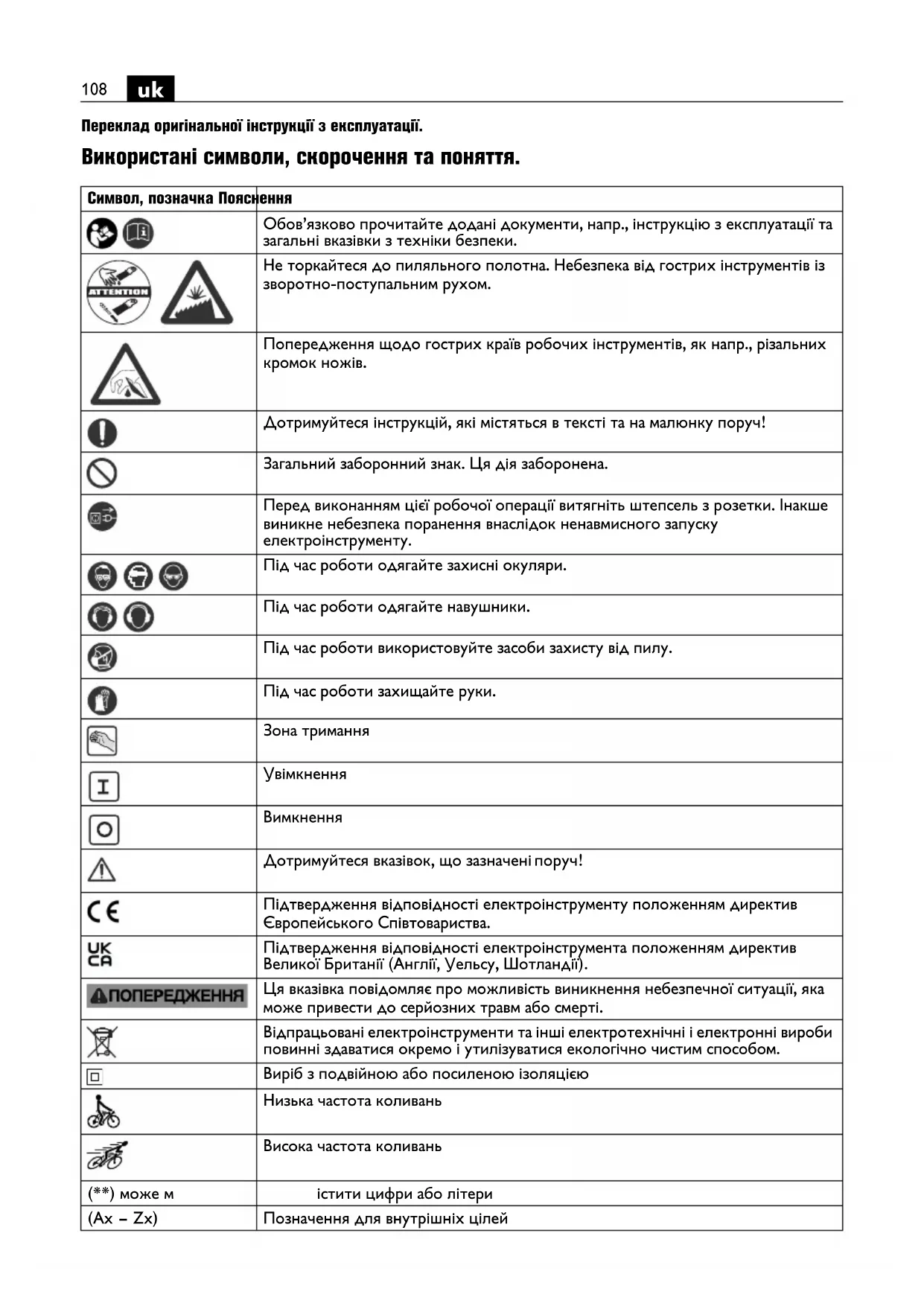Підтвердження відповідності електроінструменту положенням директив Європейського Співтовариства. Підтвердження відповідності електроінструмента положенням директив Великої Британії (Англії, Уельсу, Шотландії). Ця вказівка повідомляє про можливість виникнення небезпечної ситуації, яка може привести до серйозних травм або смерті. Відпрацьовані електроінструменти та інші електротехнічні і електронні вироби повинні здаватися окремо і утилізуватися екологічно чистим способом. Виріб з подвійною або посиленою ізоляцією Низька частота коливань Висока частота коливань (**) може м істити цифри або літери (Ax – Zx) Позначення для внутрішніх цілей109