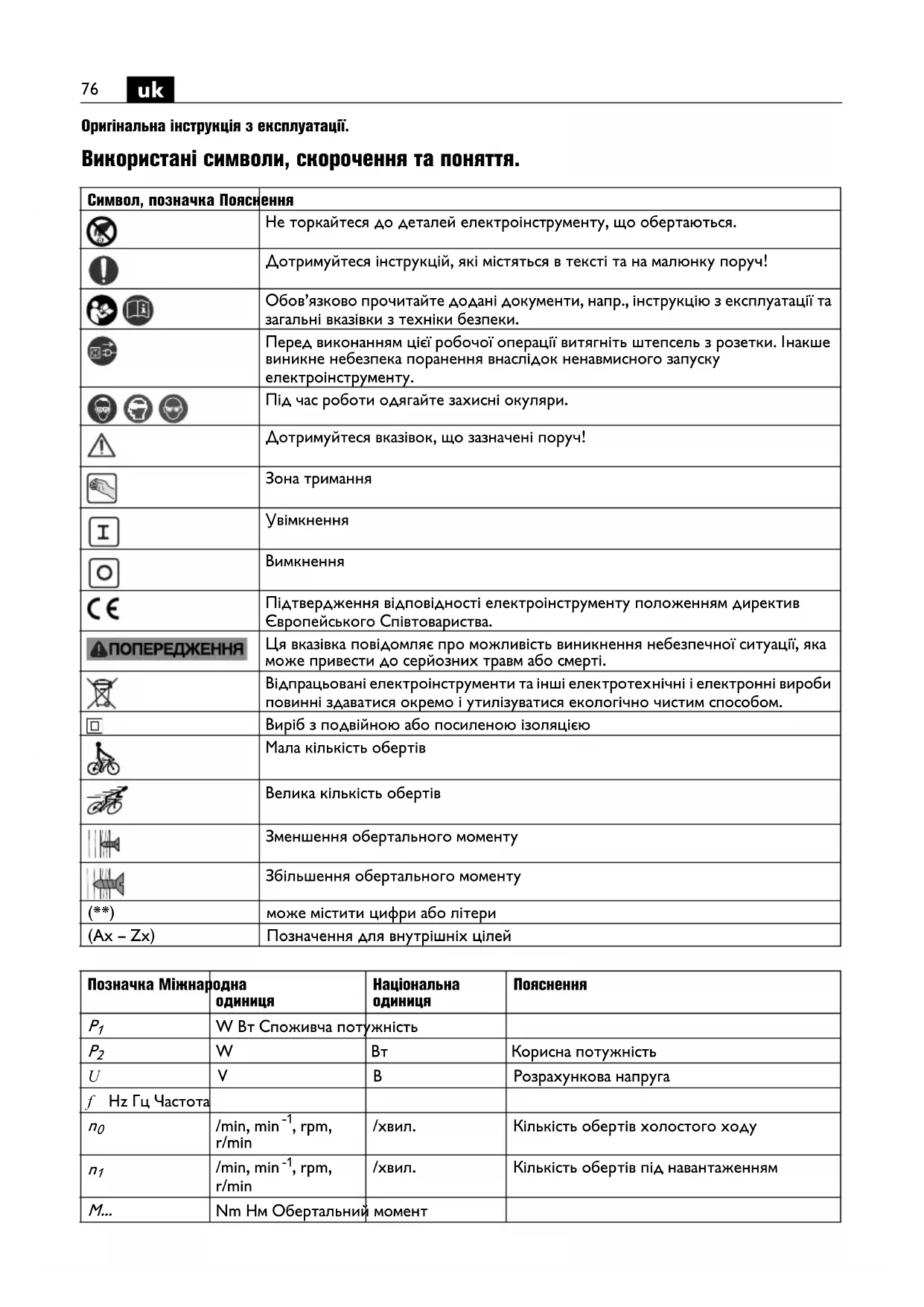 Оригінальна інструкція з експлуатації. Використані символи, скорочення та поняття. Символ, позначка Пояснення Не торкайтеся до деталей електроінструменту, що обертаються. Дотримуйтеся інструкцій, які містяться в тексті та на малюнку поруч! Обов’язково прочитайте додані документи, напр., інструкцію з експлуатації та загальні вказівки з техніки безпеки. Перед виконанням цієї робочої операції витягніть штепсель з розетки. Інакше виникне небезпека поранення внаслідок ненавмисного запуску електроінструменту. Під час роботи одягайте захисні окуляри. Дотримуйтеся вказівок, що зазначені поруч! Зона тримання