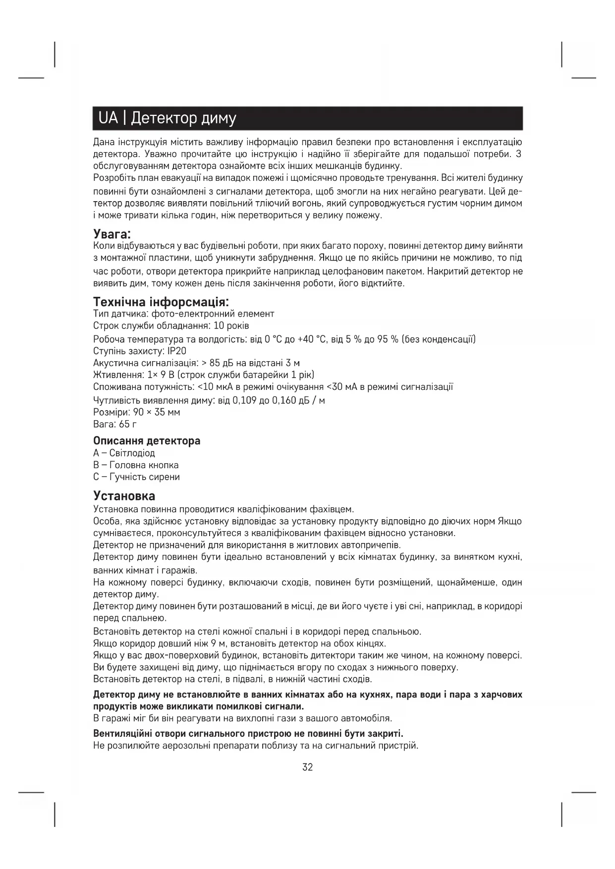 Коли відбуваються у вас будівельні роботи, при яких багато пороху, повинні детектор диму вийняти з монтажної пластини, щоб уникнути забруднення. Якщо це по якійсь причини не можливо, то під час роботи, отвори детектора прикрийте наприклад целофановим пакетом. Накритий детектор не виявить дим, тому кожен день після закінчення роботи, його відктийте. Технічна інфорсмація: Тип датчика: фото-електронний елемент Строк служби обладнання: 10 років Робоча температура та волдогість: від 0 °C до +40 °C, від 5% до 95% (без конденсації) Ступінь захисту: IP20 Акустична сигналізація: > 85 дБ на відстані 3 м Жтивлення: 1× 9 В (строк служби батарейки 1 рік) Споживана потужність: <10 мкА в режимі очікування <30 мА в режимі сигналізації Чутливість виявлення диму: від 0,109 до 0,160 дБ / м Розміри: 90 × 35 мм Вага: 65 г Описання детектора A – Світлодіод B – Головна кнопка C – Гучність сирени