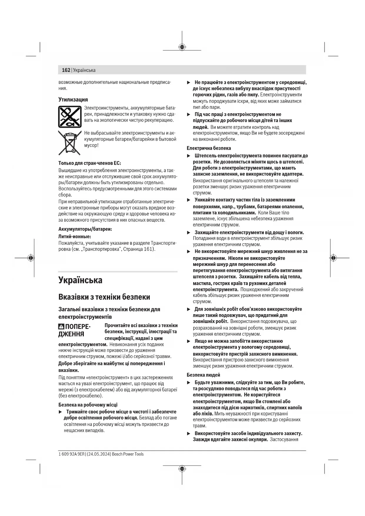 u Використовуйте засоби індивідуального захисту. Завжди вдягайте захисні окуляри. Застосування 1 609 92A 9ER | (24.05.2024) Bosch Power ToolsУкраїнська | 163 засобів індивідуального захисту для відповідних умов, напр.,захисної маски, спецвзуття, що не ковзається, каски та навушників, зменшує ризик травм. u Уникайте випадкового вмикання. Перш ніж увімкнути електроінструмент в електромережу або під’єднати акумуляторну батарею, брати його в руки або переносити, впевніться в тому, що електроінструмент вимкнений. Тримання пальця на вимикачі під час перенесення електроінструмента або підключення в розетку увімкнутого електроінструмента може призвести до травм. u Перед тим, як вмикати електроінструмент, приберіть налагоджувальні інструменти або гайковий ключ. Перебування налагоджувального інструмента або ключа в частині електроінструмента, що обертається, може призвести до травм. u Уникайте неприродного положення тіла. Завжди зберігайте стійке положення та тримайте рівновагу. Це дозволить Вам краще контролювати електроінструмент у небезпечних ситуаціях. u Вдягайте придатний одяг. Не вдягайте просторий одяг та прикраси. Не підставляйте волосся й одяг до деталей, що рухаються. Просторий одяг, довге волосся та прикраси можуть потрапити в деталі, що