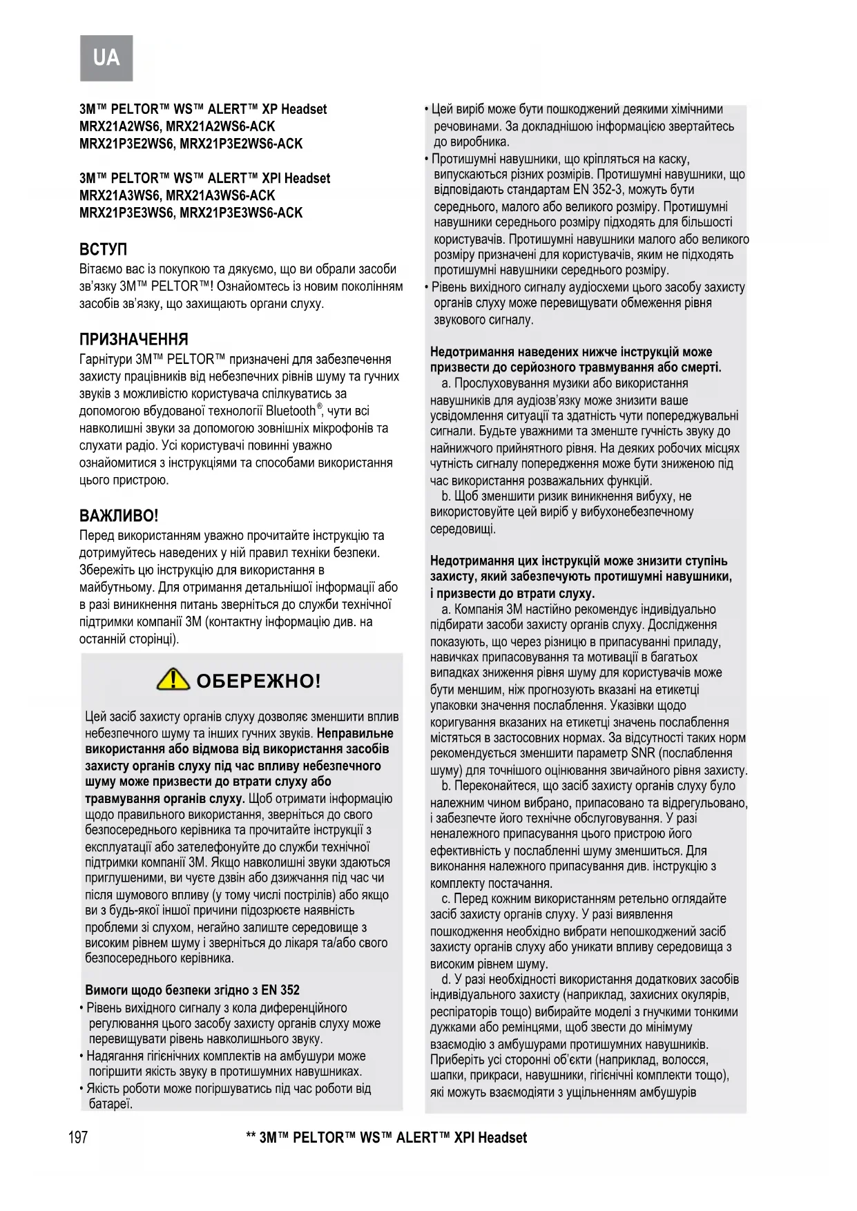 Цей засіб захисту органів слуху дозволяє зменшити вплив небезпечного шуму та інших гучних звуків. Неправильне використання або відмова від використання засобів захисту органів слуху під час впливу небезпечного шуму може призвести до втрати слуху або травмування органів слуху. Щоб отримати інформацію щодо правильного використання, зверніться до свого безпосереднього керівника та прочитайте інструкції з експлуатації або зателефонуйте до служби технічної підтримки компанії 3М. Якщо навколишні звуки здаються приглушеними, ви чуєте дзвін або дзижчання під час чи після шумового впливу (у тому числі пострілів) або якщо ви з будь-якої іншої причини підозрюєте наявність проблеми зі слухом, негайно залиште середовище з високим рівнем шуму і зверніться до лікаря та/або свого безпосереднього керівника.Вимоги щодо безпеки згідно з EN 352• Рівень вихідного сигналу з кола диференційного регулювання цього засобу захисту органів слуху може перевищувати рівень навколишнього звуку.• Надягання гігієнічних комплектів на амбушури може погіршити якість звуку в протишумних навушниках.• Якість роботи може погіршуватись під час роботи від батареї. • Цей виріб може бути пошкоджений деякими хімічними речовинами. За докладнішою інформацією звертайтесь до виробника.• Протишумні навушники, що кріпляться на каску, випускаються різних розмірів. Протишумні навушники, що відповідають стандартам EN 352-3, можуть бути середнього, малого або великого розміру. Протишумні навушники середнього розміру підходять для більшості користувачів. Протишумні навушники малого або великого розміру призначені для користувачів, яким не підходять протишумні навушники середнього розміру.• Рівень вихідного сигналу аудіосхеми цього засобу захисту органів слуху може перевищувати обмеження рівня звукового сигналу.Недотримання наведених нижче інструкцій може призвести до серйозного травмування або смерті.а. Прослуховування музики або використання навушників для аудіозв’язку може знизити ваше усвідомлення ситуації та здатність чути попереджувальні сигнали. Будьте уважними та зменште гучність звуку до найнижчого прийнятного рівня. На деяких робочих місцях чутність сигналу попередження може бути зниженою під час використання розважальних функцій.b. Щоб зменшити ризик виникнення вибуху, не використовуйте цей виріб у вибухонебезпечному середовищі.Недотримання цих інструкцій може знизити ступінь захисту, який забезпечують протишумні навушники, і призвести до втрати слуху.a. Компанія 3М настійно рекомендує індивідуально підбирати засоби захисту органів слуху. Дослідження показують, що через різницю в припасуванні приладу, навичках припасовування та мотивації в багатьох випадках зниження рівня шуму для користувачів може бути меншим, ніж прогнозують вказані на етикетці упаковки значення послаблення. Указівки щодо коригування вказаних на етикетці значень послаблення містяться в застосовних нормах. За відсутності таких норм рекомендується зменшити параметр SNR (послаблення шуму) для точнішого оцінювання звичайного рівня захисту.b. Переконайтеся, що засіб захисту органів слуху було належним чином вибрано, припасовано та відрегульовано, і забезпечте його технічне обслуговування. У разі неналежного припасування цього пристрою його ефективність у посл