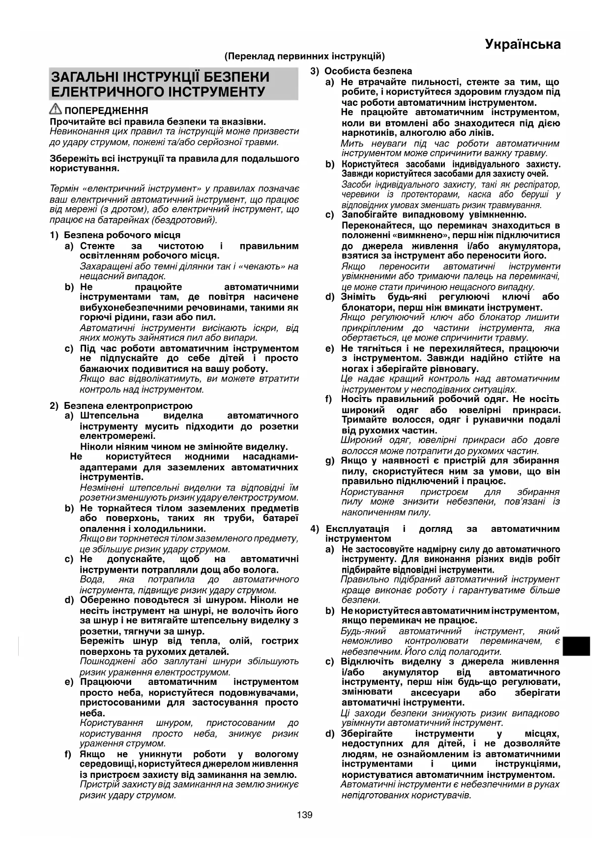 аксесуари або зберігати автоматичні інструменти. Ці заходи безпеки знижують ризик випадково увімкнути автоматичний інструмент. d) Зберігайте інструменти у місцях, недоступних для дітей, і не дозволяйте людям, не ознайомленим із автоматичними інструментами і цими інструкціями, користуватися автоматичним інструментом. Автоматичні інструменти є небезпечними в руках непідготованих користувачів. ЗАГАЛЬНІ ІНСТРУКЦІЇ БЕЗПЕКИ ЕЛЕКТРИЧНОГО ІНСТРУМЕНТУ ПОПЕРЕДЖЕННЯ Прочитайте всі правила безпеки та вказівки. Невиконання цих правил та інструкцій може призвести до удару струмом, пожежі та/або серйозної травми. Збережіть всі інструкції та правила для подальшого користування. Термін «електричний інструмент» у правилах позначає ваш електричний автоматичний інструмент, що працює від мережі (з дротом), або електричний інструмент, що
