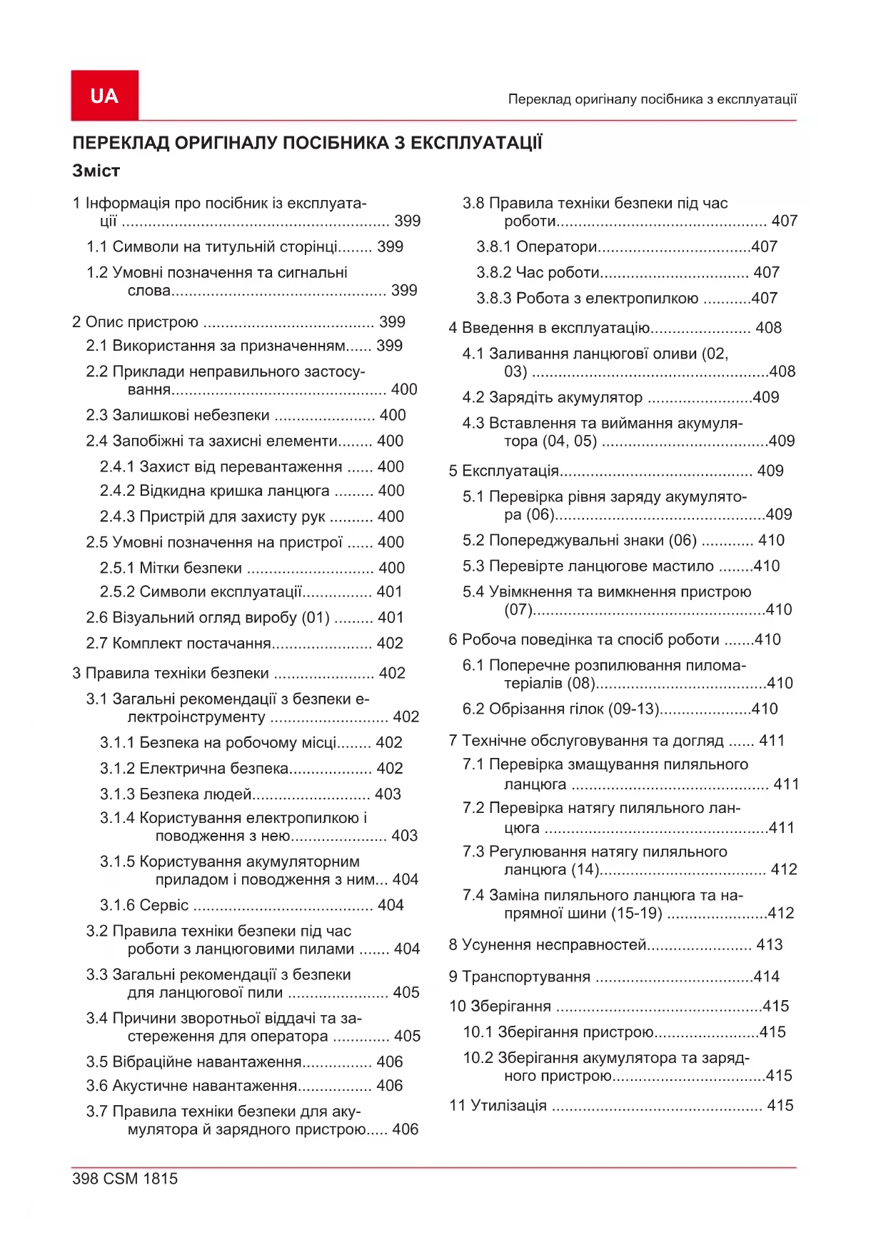 Нетипова вібрація приладу. Несправність приладу Звернутися в сервісний центр виробника.UA 414 CSM 1815 Транспортування Несправність Причина Усунення Відкидна кришка ланцюга за-