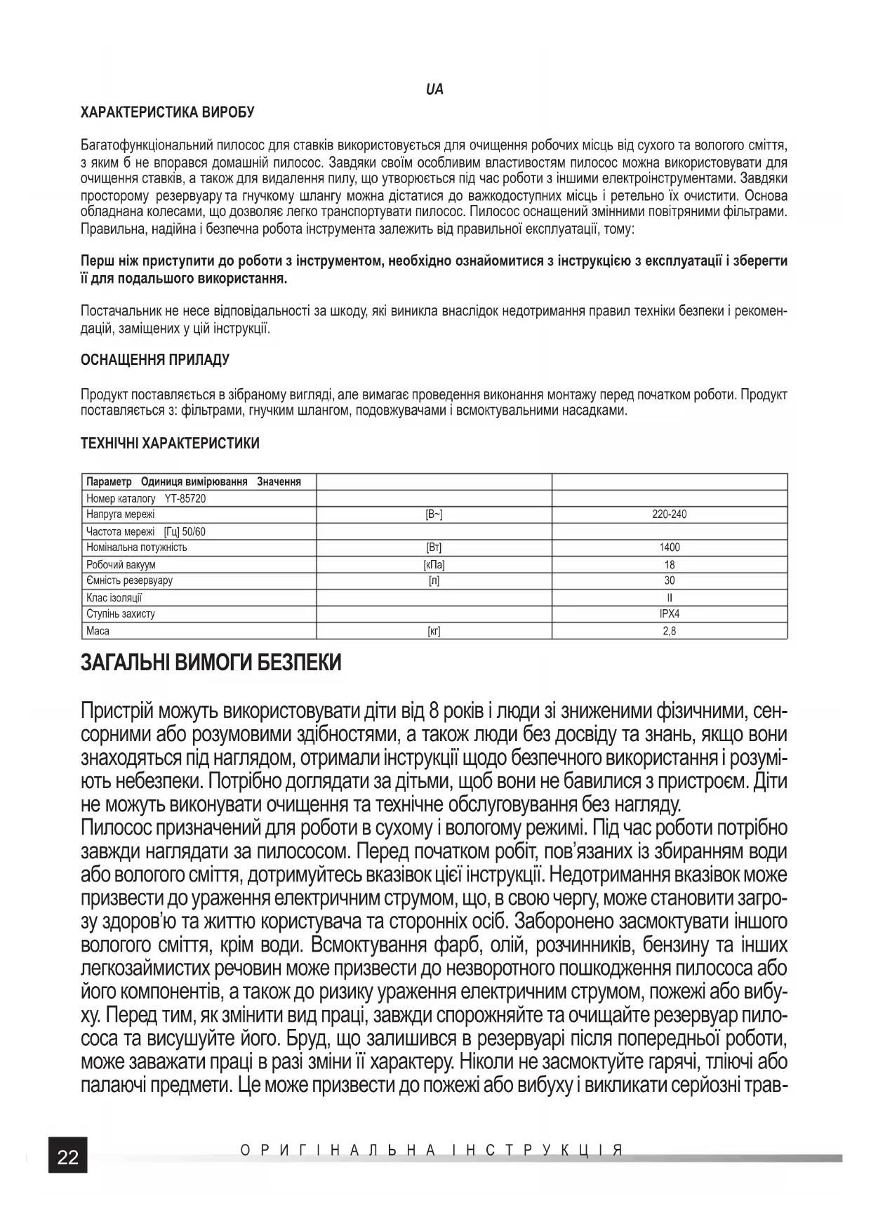 ХАРАКТЕРИСТИКА ВИРОБУ Багатофункціональний пилосос для ставків використовується для очищення робочих місць від сухого та вологого сміття, з яким б не впорався домашній пилосос. Завдяки своїм особливим властивостям пилосос можна використовувати для очищення ставків, а також для видалення пилу, що утворюється під час роботи з іншими електроінструментами. Завдяки просторому резервуару та гнучкому шлангу можна дістатися до важкодоступних місць і ретельно їх очистити. Основа обладнана колесами, що дозволяє легко транспортувати пилосос. Пилосос оснащений змінними повітряними фільтрами. Правильна, надійна і безпечна робота інструмента залежить від правильної експлуатації, тому: Перш ніж приступити до роботи з інструментом, необхідно ознайомитися з інструкцією з експлуатації і зберегти її для подальшого використання. Постачальник не несе відповідальності за шкоду, які виникла внаслідок недотримання правил техніки безпеки і рекомен- дацій, заміщених у цій інструкції. ОСНАЩЕННЯ ПРИЛАДУ Продукт поставляється в зібраному вигляді, але вимагає проведення виконання монтажу перед початком роботи. Продукт поставляється з: фільтрами, гнучким шлангом, подовжувачами і всмоктувальними насадками. ТЕХНІЧНІ ХАРАКТЕРИСТИКИ Параметр Одиниця вимірювання Значення Номер каталогу YT-85720 Напруга мережі [В~] 220-240 Частота мережі [Гц] 50/60 Номінальна потужність [Вт] 1400 Робочий вакуум [кПа]18 Ємність резервуару [л]30 Клас ізоляції II Ступінь захисту IPX4 Маса [кг] 2,8 ЗАГАЛЬНІ ВИМОГИ БЕЗПЕКИ Пристрій можуть використовувати діти від 8 років і люди зі зниженими фізичними, сен- сорними або розумовими здібностями, а також люди без досвіду та знань, якщо вони знаходяться під наглядом, отримали інструкції щодо безпечного використання і розумі- ють небезпеки. Потрібно доглядати за дітьми, щоб вони не бавилися з пристроєм. Діти не можуть виконувати очищення та технічне обслуговування без нагляду. Пилосос призначений для роботи в сухому і вологому режимі. Під час роботи потрібно завжди наглядати за пилососом. Перед початком робіт, пов’язаних із збиранням води або вологого сміття, дотримуйтесь вказівок цієї інструкції. Недотримання вказівок може призвести до ураження електричним струмом, що, в свою чергу, може становити загро- зу здоров’ю та життю користувача та сторонніх осіб. Заборонено засмоктувати іншого вологого сміття, крім води. Всмоктування фарб, олій, розчинників, бензину та інших легкозаймистих речовин може призвести до незворотного пошкодження пилососа або його компонентів, а також до ризику ураження електричним струмом, пожежі або вибу- ху. Перед тим, як змінити вид праці, завжди спорожняйте та очищайте резервуар пило- соса та висушуйте його. Бруд, що залишився в резервуарі після попередньої роботи, може заважати праці в разі зміни її характеру. Ніколи не засмоктуйте гарячі, тліючі або палаючі предмети. Це може призвести до пожежі або вибуху і викликати серйозні трав