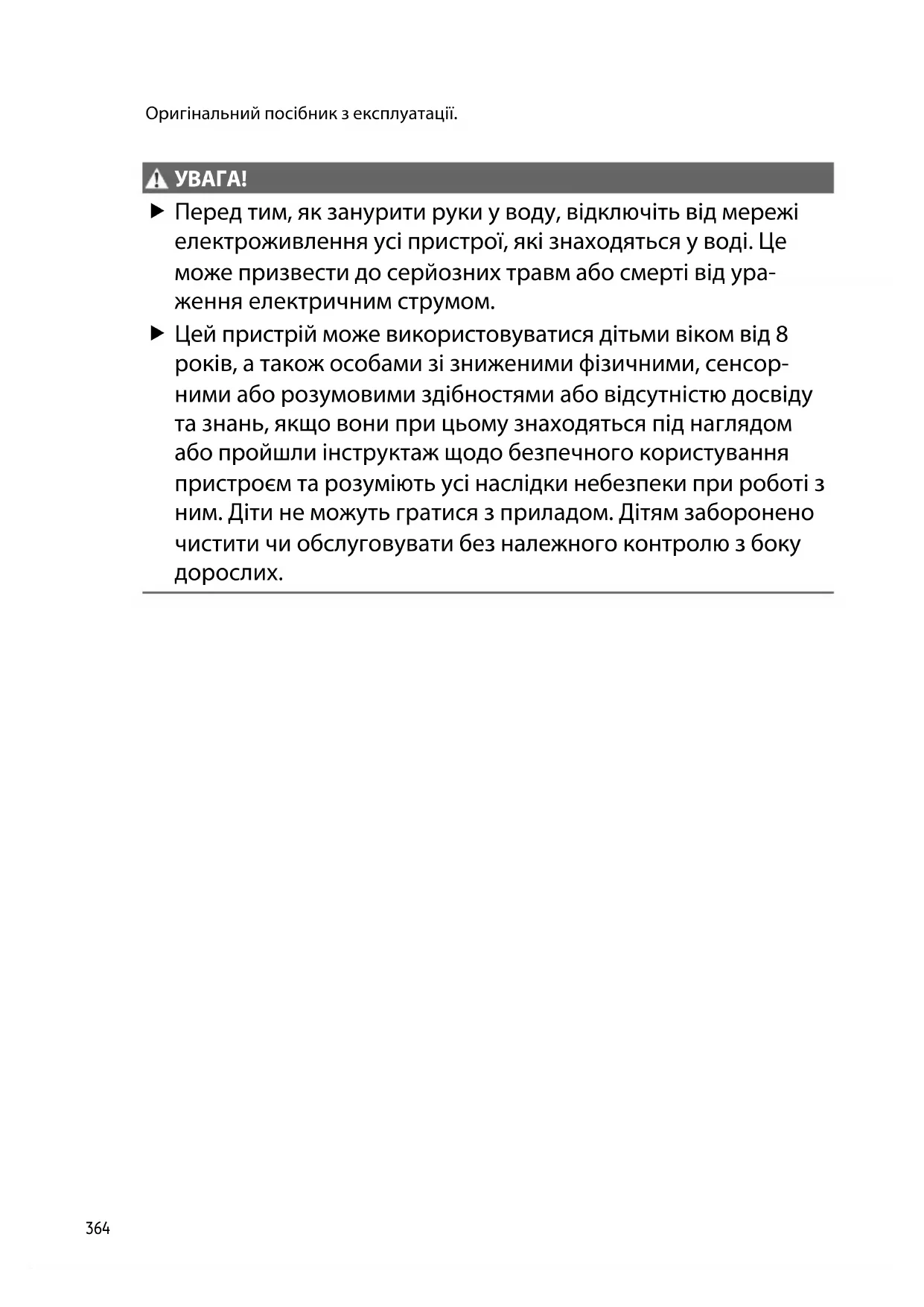 Перед тим, як занурити руки у воду, відключіть від мережі електроживлення усі пристрої, які знаходяться у воді. Це може призвести до серйозних травм або смерті від ура- ження електричним струмом. Цей пристрій може використовуватися дітьми віком від 8 років, а також особами зі зниженими фізичними, сенсор- ними або розумовими здібностями або відсутністю досвіду та знань, якщо вони при цьому знаходяться під наглядом або пройшли інструктаж щодо безпечного користування пристроєм та розуміють усі наслідки небезпеки при роботі з ним. Діти не можуть гратися з приладом. Дітям заборонено чистити чи обслуговувати без належного контролю з боку дорослих.UK
