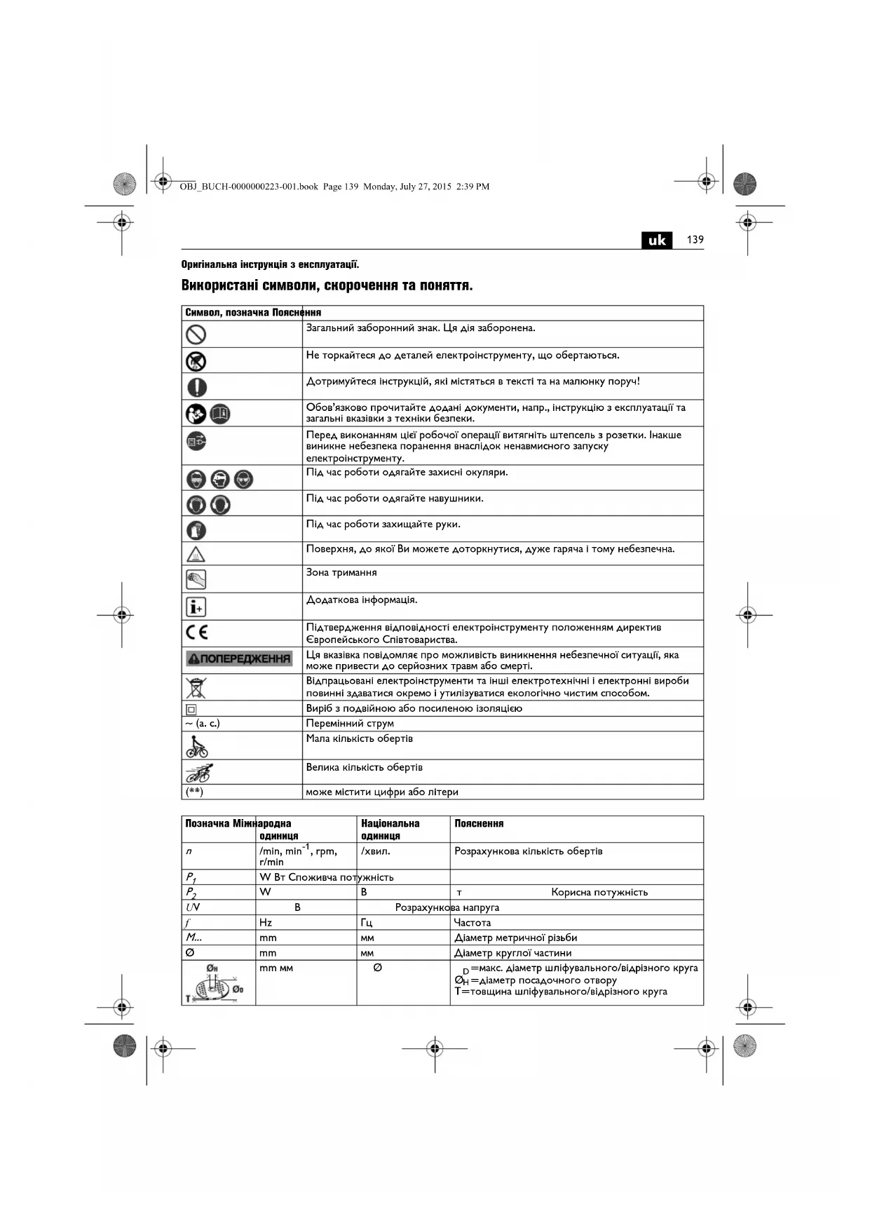 Не застосовуйте цей електроінструмент, не прочитавши уважно та не зрозумівши дану інструкцію з експлуатації та додані «Загальні вказівки з техніки безпеки» (номер документа 34130054061). Зберігайте названі документи для подальшого використання та додавайте їх до електроінструменту при його передачі в користування або при продажу. Зважайте також на чинні національні приписи з охорони праці. Призначення електроінструменту: Ручна кутова шліфмашина для сухого шліфування та різання металу і каменю для роботи в закритих приміщеннях з допущеними фірмою FEIN робочими інструментами та приладдям. Цей електроприлад придатний для експлуатації від генераторів змінного струму із достатньою потужністю, що відповідають нормі ISO 8528, клас виконання G2. Ця норма не виконується, зокрема, якщо так званий коефіцієнт гармонік перевищує 10 %. У разі сумнівів поцікавтеся інформацією про генератор, який Ви застосовуєте. Спільні попередження при шліфуванні, шліфуванні наждаком, роботах з дротяними щітками та відрізанні Цей електроприлад може використовуватися в якості шліфмашини, шліфмашини з наждачною шкуркою, дротяної щітки і абразивно-відрізного верстата. Зважайте на всі правила з техніки безпеки, вказівки, зображення інструменту і його технічні дані, що Ви отримали разом з інструментом. Недодержання нижчеподаних вказівок може призводити до ураження електричним струмом, пожежі і/або важких тілесних ушкоджень. Цей електроприлад не призначений для полірування. Використання електроінструменту з метою, для якої він не передбачений, може створювати небезпечну ситуацію і призводити до тілесних ушкоджень. Використовуйте лише приладдя, що передбачене і рекомендоване виробником спеціально для цього електроприладу. Сама лише можливість закріплення приладдя на Вашому електроприладі не гарантує його безпечне використання. Допустима кількість обертів робочого інструмента повинна як мінімум відповідати максимальній кількості обертів, що зазначена на електроприладі. Приладдя, що обертається швидше дозволеного, може зламатися і розлетітися. Зовнішній діаметр і товщина робочого інструмента повинна відповідати параметрам Вашого електроприладу. При неправильних розмірах робочого інструмента існує небезпека того, що робочий інструмент буде недостатньо прикриватися та Ви можете втратити контроль над ним. mm мм Ø