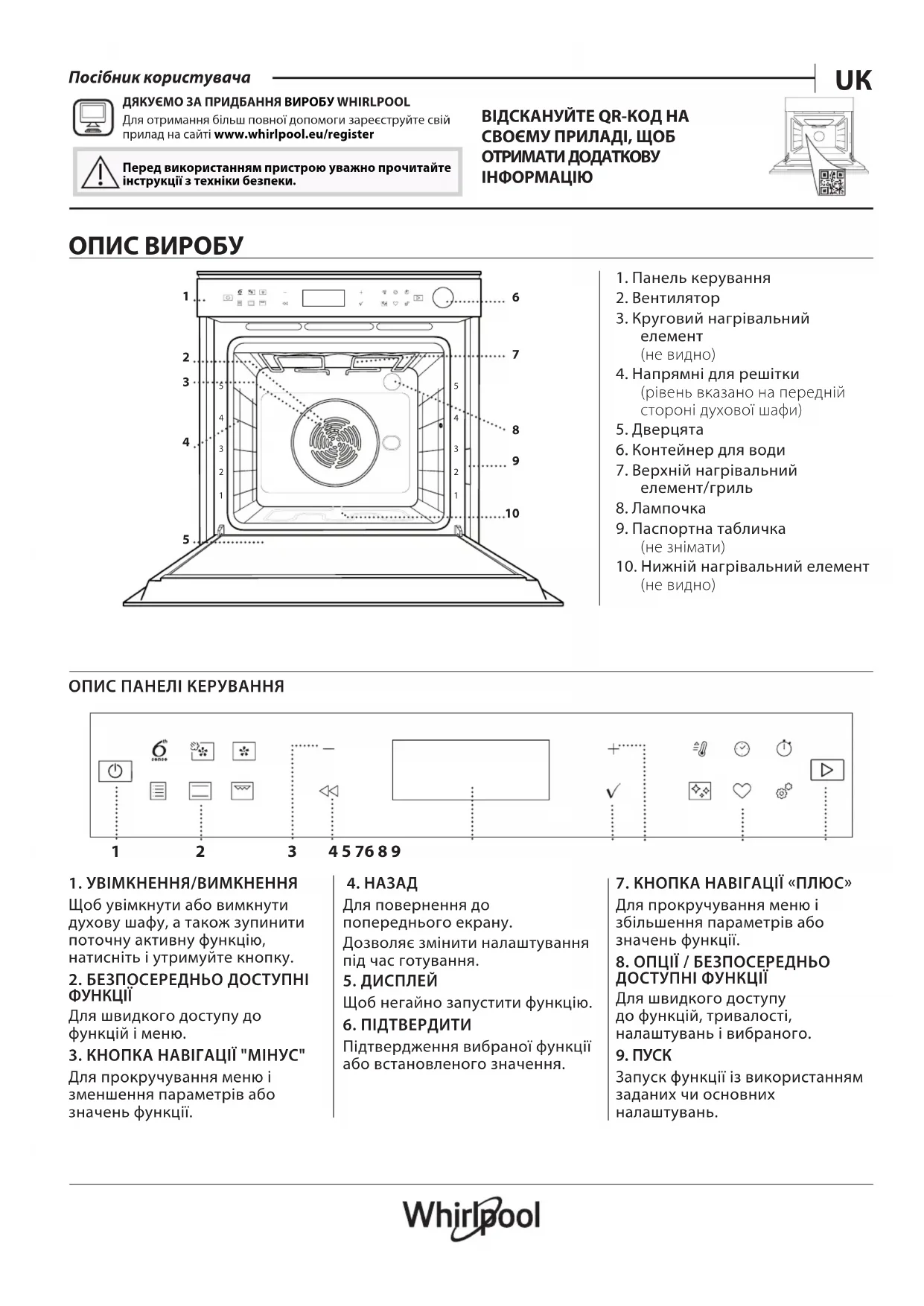 - Eller kontakta vår kundservice (Se telefonnumret i garantihäftet). När du kontaktar vår kundservice, ange koderna som står på produktens typskylt. 400011669605 REV. AUК Посібник користувача ДЯКУЄМО ЗА ПРИДБАННЯ ВИРОБУ WHIRLPOOL Для отримання більш повної допомоги зареєструйте свій прилад на сайті www.whirlpool.eu/register ВІДСКАНУЙТЕ QR-КОД НА СВОЄМУ ПРИЛАДІ, ЩОБ ОТРИМАТИ ДОДАТКОВУ