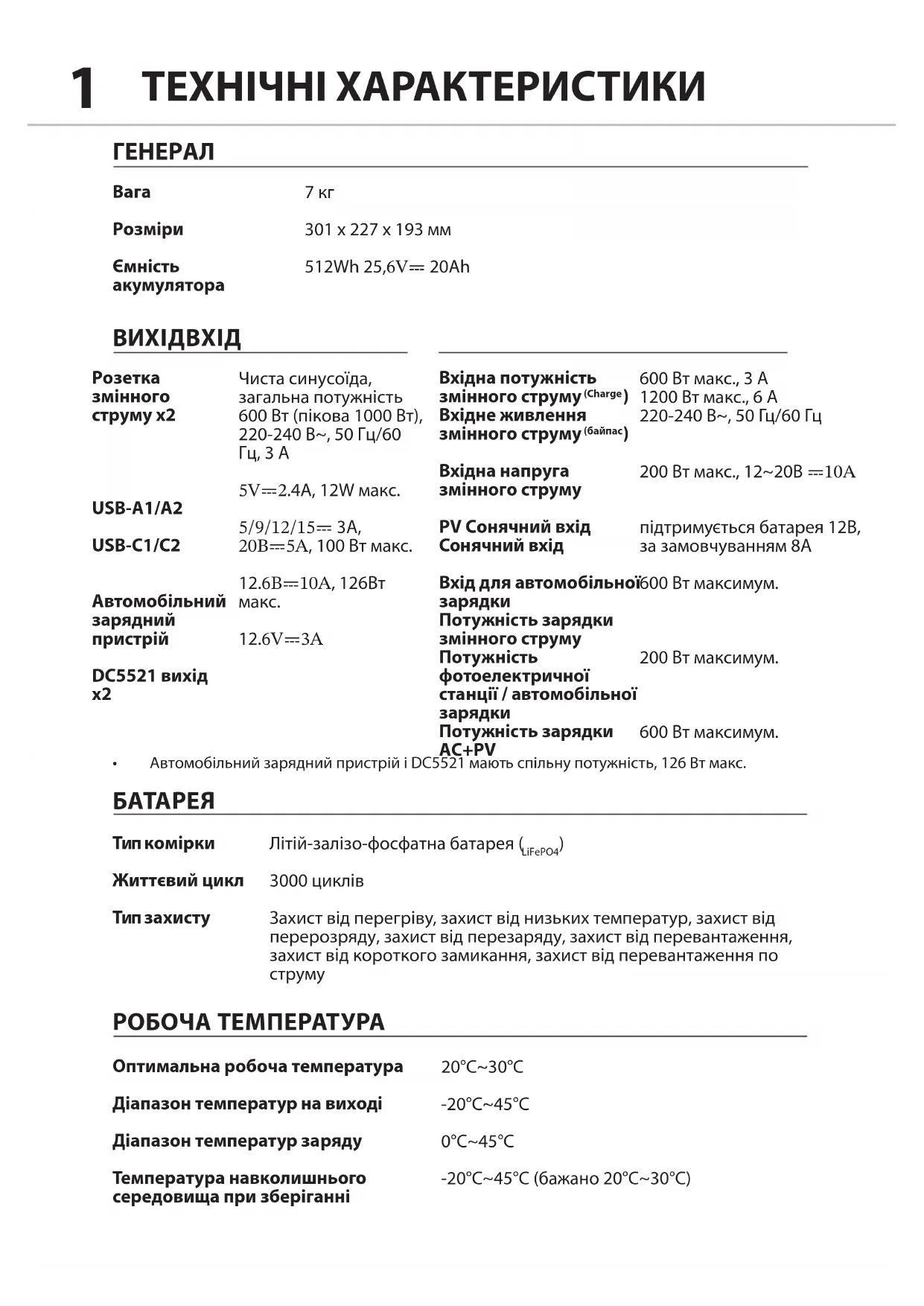 РОБОЧА ТЕМПЕРАТУРА Чиста синусоїда, загальна потужність 600 Вт (пікова 1000 Вт), 220-240 В~, 50 Гц/60 Гц, 3 А 5V⎓2.4A, 12W макс. 5/9/12/15⎓ 3А, 20В⎓5А, 100 Вт макс. 12.6В⎓10А, 126Вт