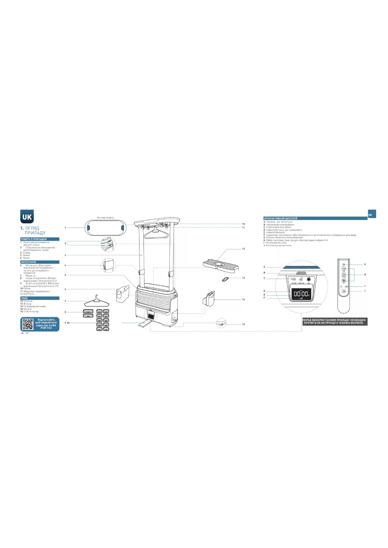 12 Полиця 13 Фільтр 14 Резервуар для води 15 Колеса 16 Стабілізатор Вигляд зверху Відскануйте, щоб подивитися відео про CARE FOR YOU