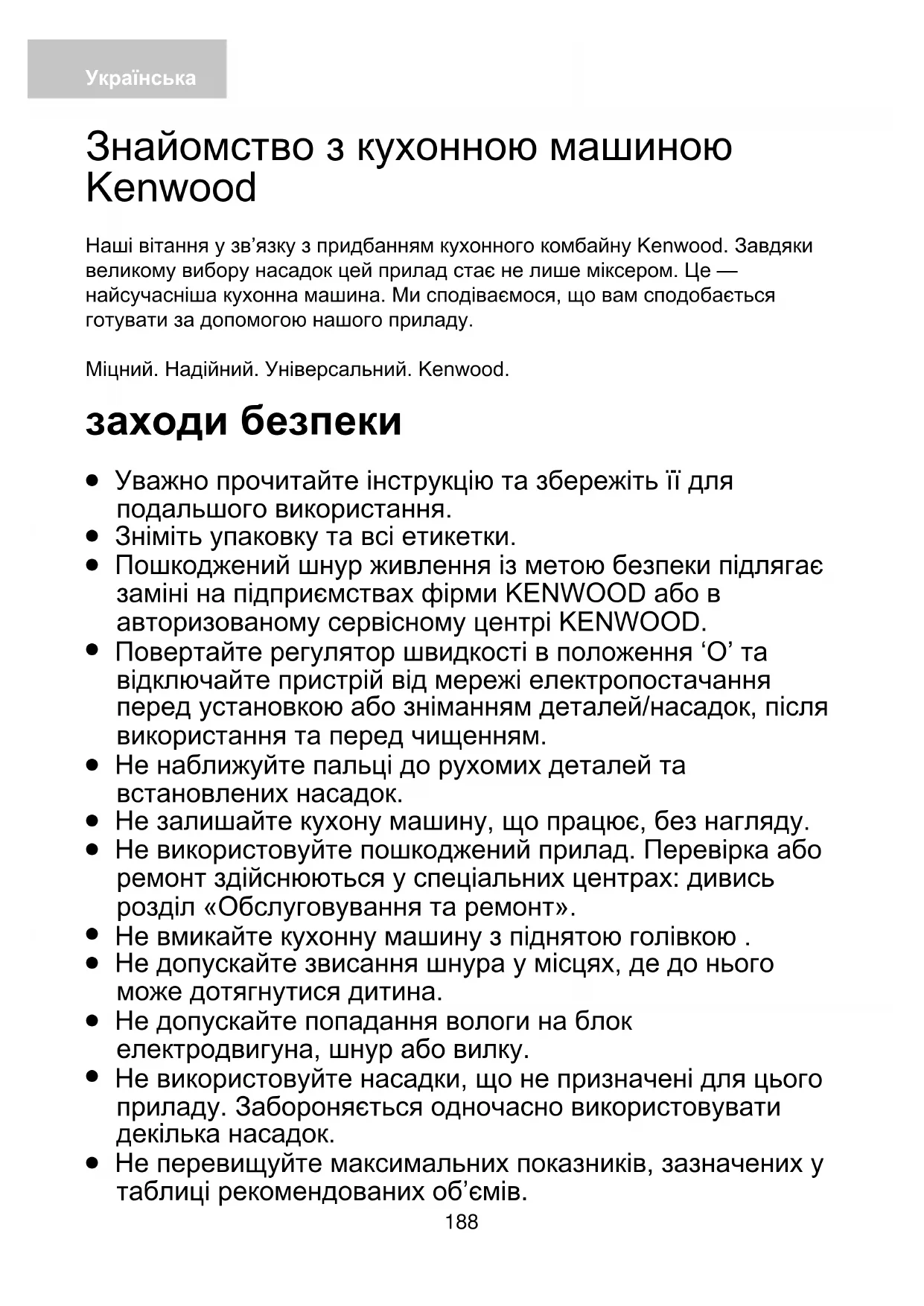 Цей прилад призначений виключно для використання у побуті. Компанія Kenwood не несе відповідальності за невідповідне використання приладу або порушення правил експлуатації, викладених у цій інструкції. Українська190 Перед підключенням до мережі електропостачання