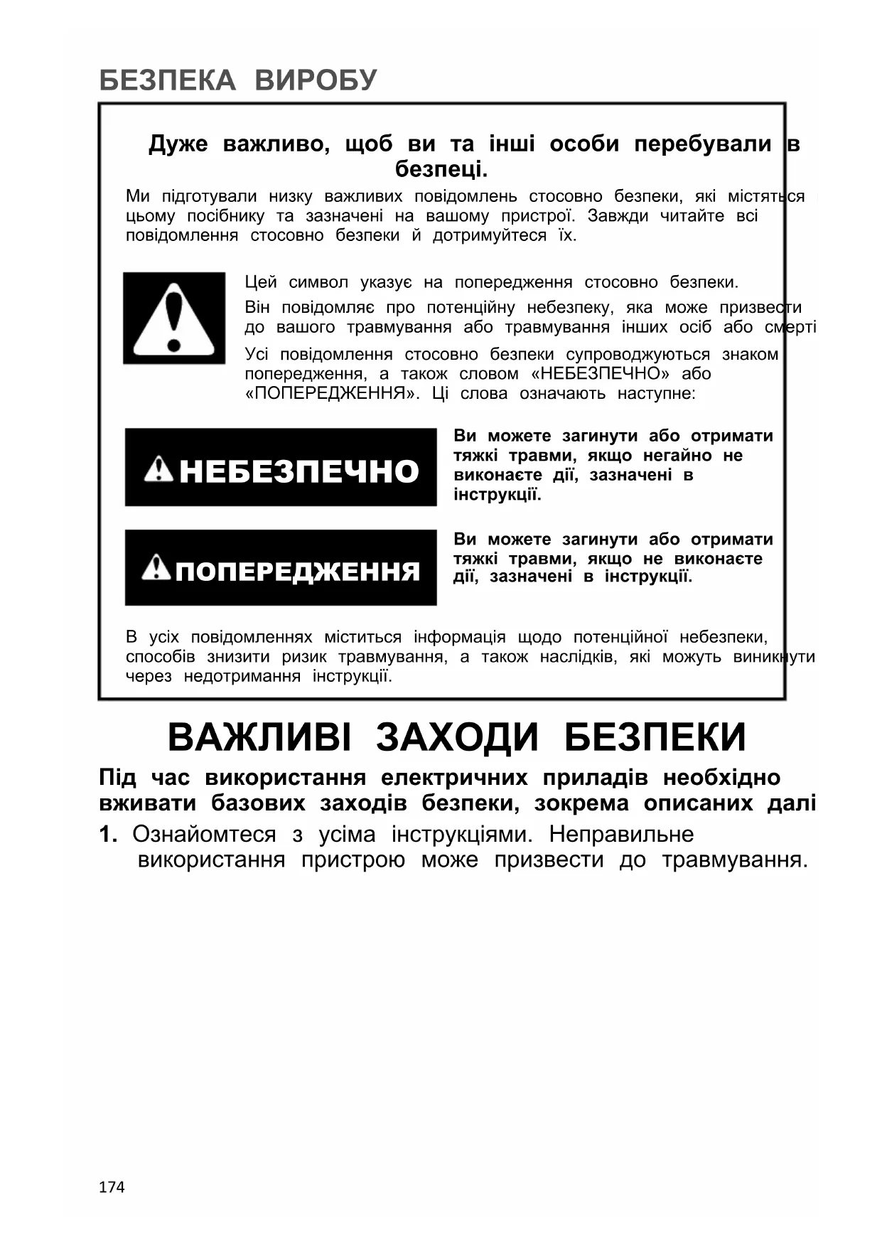 Ми підготували низку важливих повідомлень стосовно безпеки, які містяться вцьому посібнику та зазначені на вашому пристрої. Завжди читайте всіповідомлення стосовно безпеки й дотримуйтеся їх.Цей символ указує на попередження стосовно безпеки.Він повідомляє про потенційну небезпеку, яка може призвестидо вашого травмування або травмування інших осіб або смерті.Усі повідомлення стосовно безпеки супроводжуються знакомпопередження, а також словом «НЕБЕЗПЕЧНО» або«ПОПЕРЕДЖЕННЯ». Ці слова означають наступне: Ви можете загинути або отриматитяжкі травми, якщо негайно невиконаєте дії, зазначені вінструкції. ПОПЕРЕДЖЕННЯ Ви можете загинути або отриматитяжкі травми, якщо не виконаєтедії, зазначені в інструкції.В усіх повідомленнях міститься інформація щодо потенційної небезпеки,способів знизити ризик травмування, а також наслідків, які можуть виникнутичерез недотримання інструкції. ВАЖЛИВІ ЗАХОДИ БЕЗПЕКИ Під час використання електричних приладів необхідно вживати базових заходів безпеки, зокрема описаних далі.