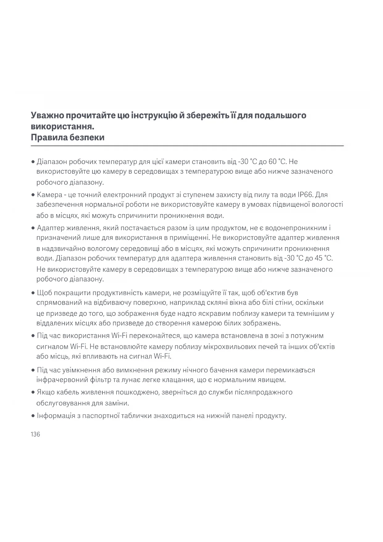 қатаң сәйкестікте пайдаланылса, өндіруші белгілеген өнімнің қызмет мерзімі 5 жыл.136 ○ Діапазон робочих температур для цієї камери становить від -30 °C до 60 °C. Не використовуйте цю камеру в середовищах з температурою вище або нижче зазначеного робочого діапазону. ○ Камера - це точний електронний продукт зі ступенем захисту від пилу та води IP66. Для забезпечення нормальної роботи не використовуйте камеру в умовах підвищеної вологості або в місцях, які можуть спричинити проникнення води. ○ Адаптер живлення, який постачається разом із цим продуктом, не є водонепроникним і призначений лише для використання в приміщенні. Не використовуйте адаптер живлення в надзвичайно вологому середовищі або в місцях, які можуть спричинити проникнення води. Діапазон робочих температур для адаптера живлення становить від -30 °C до 45 °C. Не використовуйте камеру в середовищах з температурою вище або нижче зазначеного робочого діапазону. ○ Щоб покращити продуктивність камери, не розміщуйте її так, щоб об'єктив був спрямований на відбиваючу поверхню, наприклад скляні вікна або білі стіни, оскільки це призведе до того, що зображення буде надто яскравим поблизу камери та темнішим у віддалених місцях або призведе до створення камерою білих зображень. ○ Під час використання Wi-Fi переконайтеся, що камера встановлена в зоні з потужним сигналом Wi-Fi. Не встановлюйте камеру поблизу мікрохвильових печей та інших об'єктів або місць, які впливають на сигнал Wi-Fi. ○ Під час увімкнення або вимкнення режиму нічного бачення камери перемикає