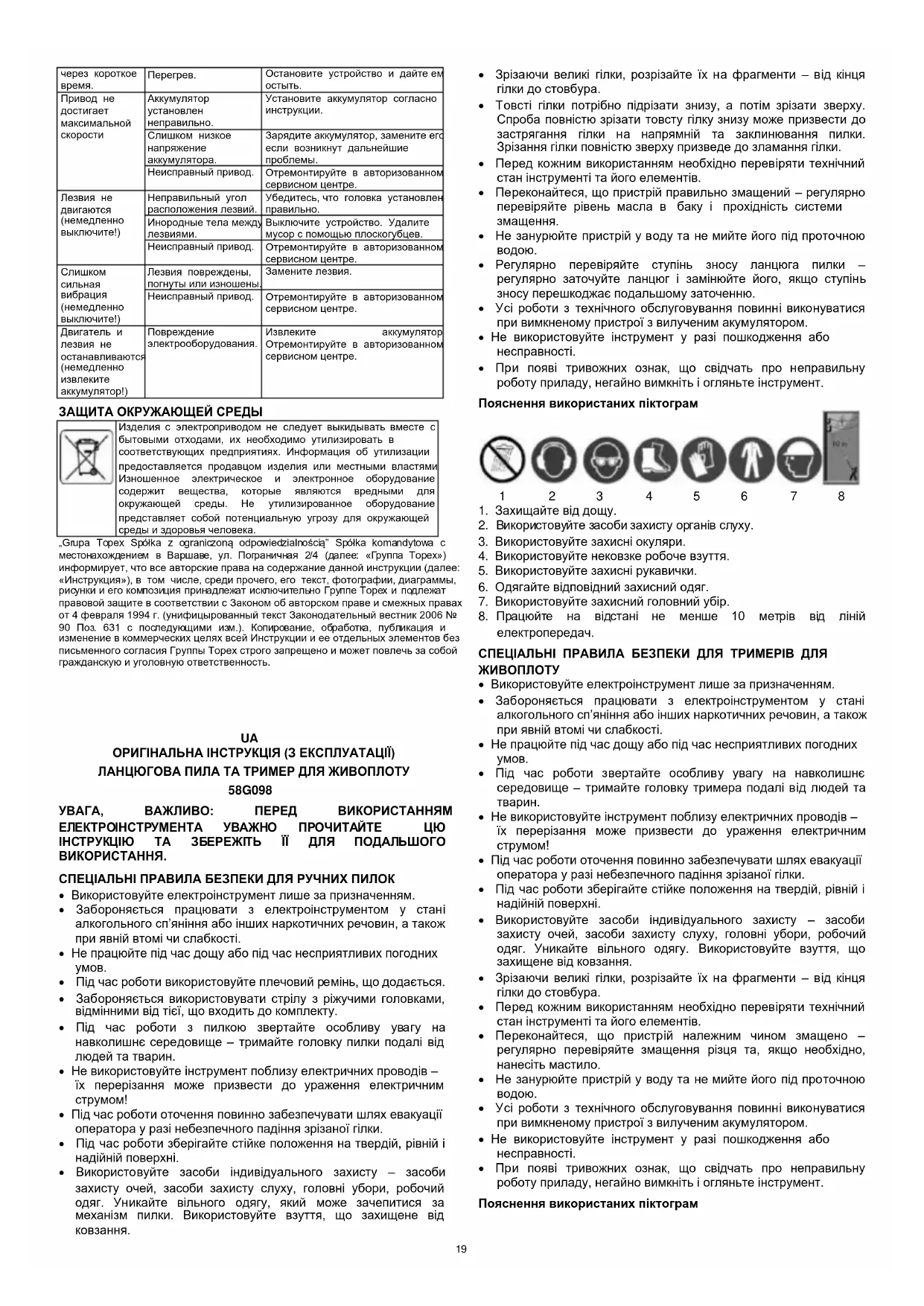Продукти, що мають електричне живлення, не можна викидати разом з побутовими відходами; їх слід здавати на утилізацію у відповідні заклади. Інформацію про утилізацію можна отримати у продавця продукту або у місцевих органів влади. Використане електричне та електронне обладнання містить речовини, які не є нейтральними для природного середовища. Неперероблене обладнання становить потенційну загрозу для навколишнього середовища та здоров'я людей. „Grupa Topex Spółka z ograniczoną odpowiedzialnością” Spółka komandytowa із зареєстрованим офісом у Варшаві, вул. Погранічна 2/4 (далі: Група Topex) інформує, що всі авторські права на вміст даної інструкції (далі: Інструкція) в тому числі на текст, розміщені фотографії, схеми, малюнки, а також її композицію, належать виключно Групі Topex і підлягають правовому захисту відповідно до закону від 4 лютого 1994 року про авторське право та суміжні права (уніфікований текст Законодавчий вісник 2006 № 90 Поз. 631 з подальшими змінами). Копіювання, обробка, публікування, модифікування у комерційних цілях всієї інструкції або окремих її елементів без письмової згоди Групи Topex суворо забороняється і може спричинити притягнення до цивільної та кримінальної відповідальності.