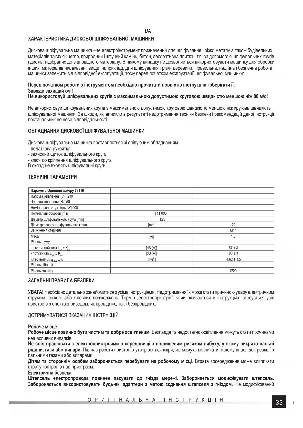 ХАРАКТЕРИСТИКА ДИСКОВОЇ ШЛІФУВАЛЬНОЇ МАШИНКИ Дискова шліфувальна машинка –це електроінструмент призначений для шліфування і різки металу а також будівельних матеріалів таких як цегла, природний і штучний камінь, бетон, декоративна плитка і.т.п. за допомогою шліфувальних кругів і дисків, підібраних до відповідного матеріалу. В ніякому випадку не дозволяється використовувати машинку для обробки інших матеріалів ніж вказаніі вище, наприклад, для шліфування і різки деревини. Правильна, надійна і безпечна робота машинки залежить від відповідної експлуатації, тому перед початком експлуатації шліфувальноі машинки: Перед початком роботи з інструментом необхідно прочитати повністю інструкцію і зберігати її. Завжди захищай очі! Не використовуй шліфувальних кругів з максимальною допустимою круговою швидкістю меншою ніж 80 м/с! Не використовуй шліфувальних кругів з максимальною допустимою круговою швидкістю меншою ніж кругова швидкість шліфувальної машинки. За шкоди, які виникли в результаті недотримання техніки безпеки і рекомендацій даної інструкції постачальник не несе відповідальності. ОБЛАДНАННЯ ДИСКОВОЇ ШЛІФУВАЛЬНОЇ МАШИНКИ Дискова шліфувальна машинка поставляється зі слідуючим обладнанням - додаткова рукоятка - захисний щиток шліфувального круга - ключ до кріплення шліфувального круга В склад не входять шліфувальні круги. ТЕХНІЧНІ ПАРАМЕТРИ Параметр Одиниця виміру 79119 Напруга живлення [V~] 230 Частота живлення [Hz] 50 Номінальна потужність [W] 900 Номінальні обороти [min