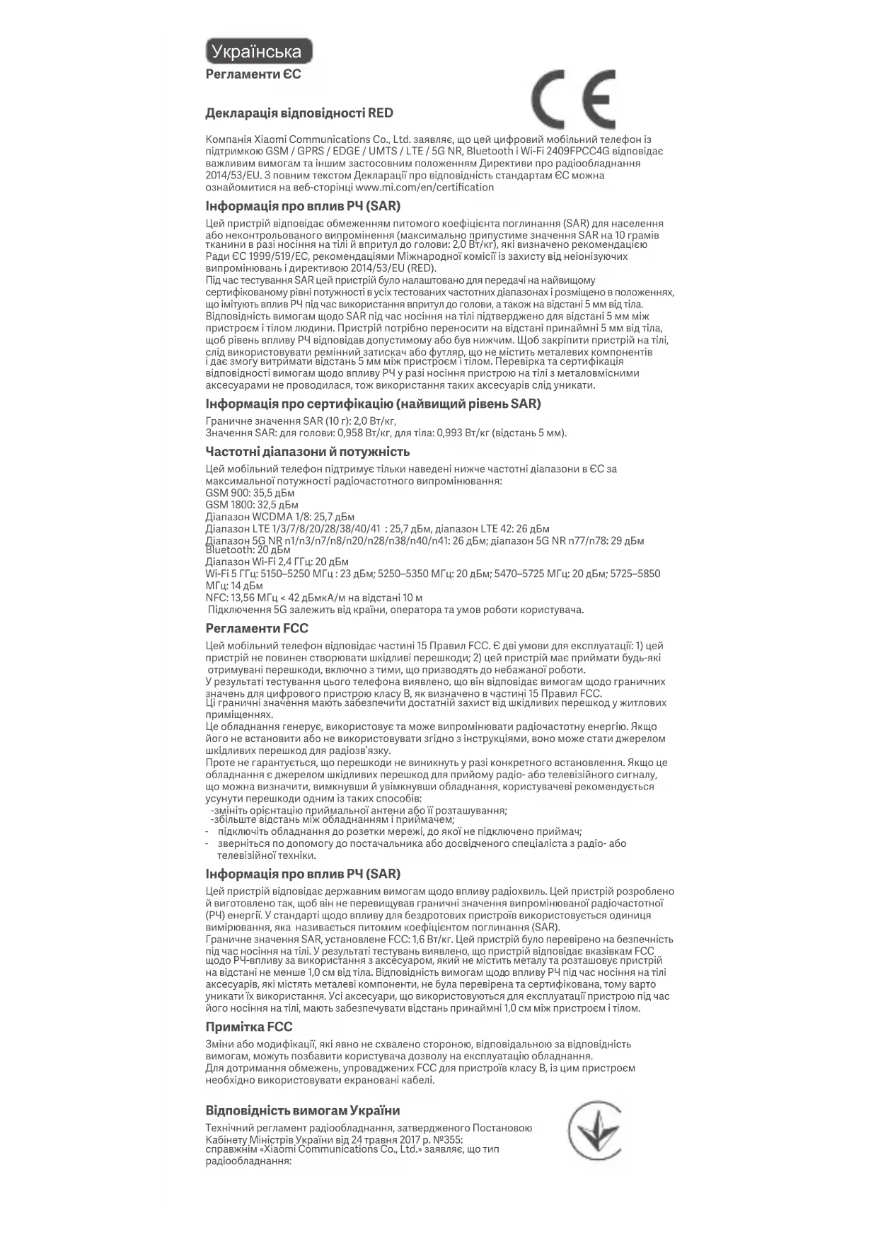 USB PDРегламенти ЄС Декларація відповідності RED Компанія Xiaomi Communications Co., Ltd. заявляє, що цей цифровий мобільний телефон із підтримкою GSM / GPRS / EDGE / UMTS / LTE / 5G NR, Bluetooth і Wi-Fi 2409FPCC4G відповідає важливим вимогам та іншим застосовним положенням Директиви про радіообладнання 2014/53/EU. З повним текстом Декларації про відповідність стандартам ЄС можна ознайомитися на веб-сторінці www.mi.com/en/certification Інформація про вплив РЧ (SAR) Цей пристрій відповідає обмеженням питомого коефіцієнта поглинання (SAR) для населення або неконтрольованого випромінення (максимально припустиме значення SAR на 10 грамів тканини в разі носіння на тілі й впритул до голови: 2,0 Вт/кг), які визначено рекомендацією Ради ЄС 1999/519/EC, рекомендаціями Міжнародної комісії із захисту від неіонізуючих випромінювань і директивою 2014/53/EU (RED). Під час тестування SAR цей пристрій було налаштовано для передачі на найвищому сертифікованому рівні потужності в усіх тестованих частотних діапазонах і розміщено в положеннях, що імітують вплив РЧ під час використання впритул до голови, а також на відстані 5 мм від тіла. Відповідність вимогам щодо SAR під час носіння на тілі підтверджено для відстані 5 мм між пристроєм і тілом людини. Пристрій потрібно переносити на відстані принаймні 5 мм від тіла, щоб рівень впливу РЧ відповідав допустимому або був нижчим. Щоб закріпити пристрій на тілі, слід використовувати ремінний затискач або футляр, що не містить металевих компонентів і дає змогу витримати відстань 5 мм між пристроєм і тілом. Перевірка та сертифікація відповідності вимогам щодо впливу РЧ у разі носіння пристрою на тілі з металовмісними аксесуарами не проводилася, тож використання таких аксесуарів слід уникати. Інформація про сертифікацію (найвищий рівень SAR) Граничне значення SAR (10 г): 2,0 Вт/кг, Значення SAR: для голови: 0,958 Вт/кг, для тіла: 0,993 Вт/кг (відстань 5 мм). Частотні діапазони й потужність Цей мобільний телефон підтримує тільки наведені нижче частотні діапазони в ЄС за максимальної потужності радіочастотного випромінювання: GSM 900: 35,5 дБм GSM 1800: 32,5 дБм Діапазон WCDMA 1/8: 25,7 дБм Діапазон LTE 1/3/7/8/20/28/38/40/41 : 25,7 дБм, діапазон LTE 42: 26 дБм Діапазон 5G NR n1/n3/n7/n8/n20/n28/n38/n40/n41: 26 дБм; діапазон 5G NR n77/n78: 29 дБм Bluetooth: 20 дБм Діапазон Wi-Fi 2,4 ГГц: 20 дБм Wi-Fi 5 ГГц: 5150–5250 МГц : 23 дБм; 5250–5350 МГц: 20 дБм; 5470–5725 МГц: 20 дБм; 5725–5850 МГц: 14 дБм NFC: 13,56 МГц < 42 дБмкА/м на відстані 10 м Підключення 5G залежить від країни, оператора та умов роботи користувача. Регламенти FCC Цей мобільний телефон відповідає частині 15 Правил FCC. Є дві умови для експлуатації: 1) цей пристрій не повинен створювати шкідливі перешкоди; 2) цей пристрій має приймати будь-які отримувані перешкоди, включно з тими, що призводять до небажаної роботи. У результаті тестування цього телефона виявлено, що він відповідає вимогам щодо граничних значень для цифрового пристрою класу B, як визначено в частині 15 Правил FCC. Ці граничні значення мають забезпечити достатній захист від шкідливих перешкод у житлових приміщеннях. Це обладнання генерує, використовує та може випромінювати радіочастотну енергію. Якщо його не встановити або не використовувати згідно з інструкціями, воно може стати джерелом шкідливих перешкод для радіозв’язку. Проте не гарантується, що перешкоди не виникнуть у разі конкретного встановлення. Якщо це обладнання є джерелом шкідливих перешкод для прийому радіо- або телевізійно
