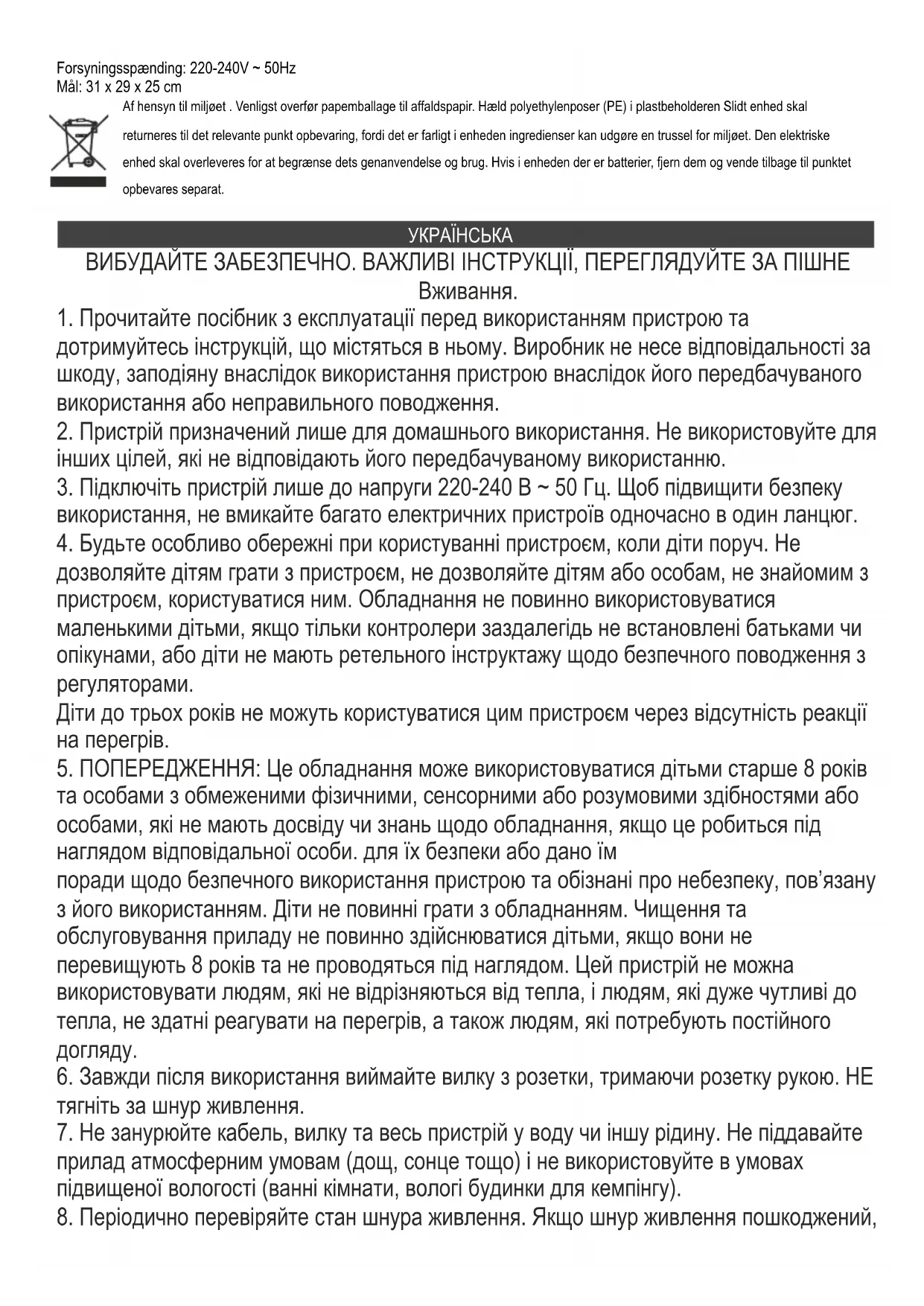та особами з обмеженими фізичними, сенсорними або розумовими здібностями або особами, які не мають досвіду чи знань щодо обладнання, якщо це робиться під наглядом відповідальної особи. для їх безпеки або дано їм поради щодо безпечного використання пристрою та обізнані про небезпеку, пов’язану з його використанням. Діти не повинні грати з обладнанням. Чищення та обслуговування приладу не повинно здійснюватися дітьми, якщо вони не перевищують 8 років та не проводяться під наглядом. Цей пристрій не можна використовувати людям, які не відрізняються від тепла, і людям, які дуже чутливі до тепла, не здатні реагувати на перегрів, а також людям, які потребують постійного