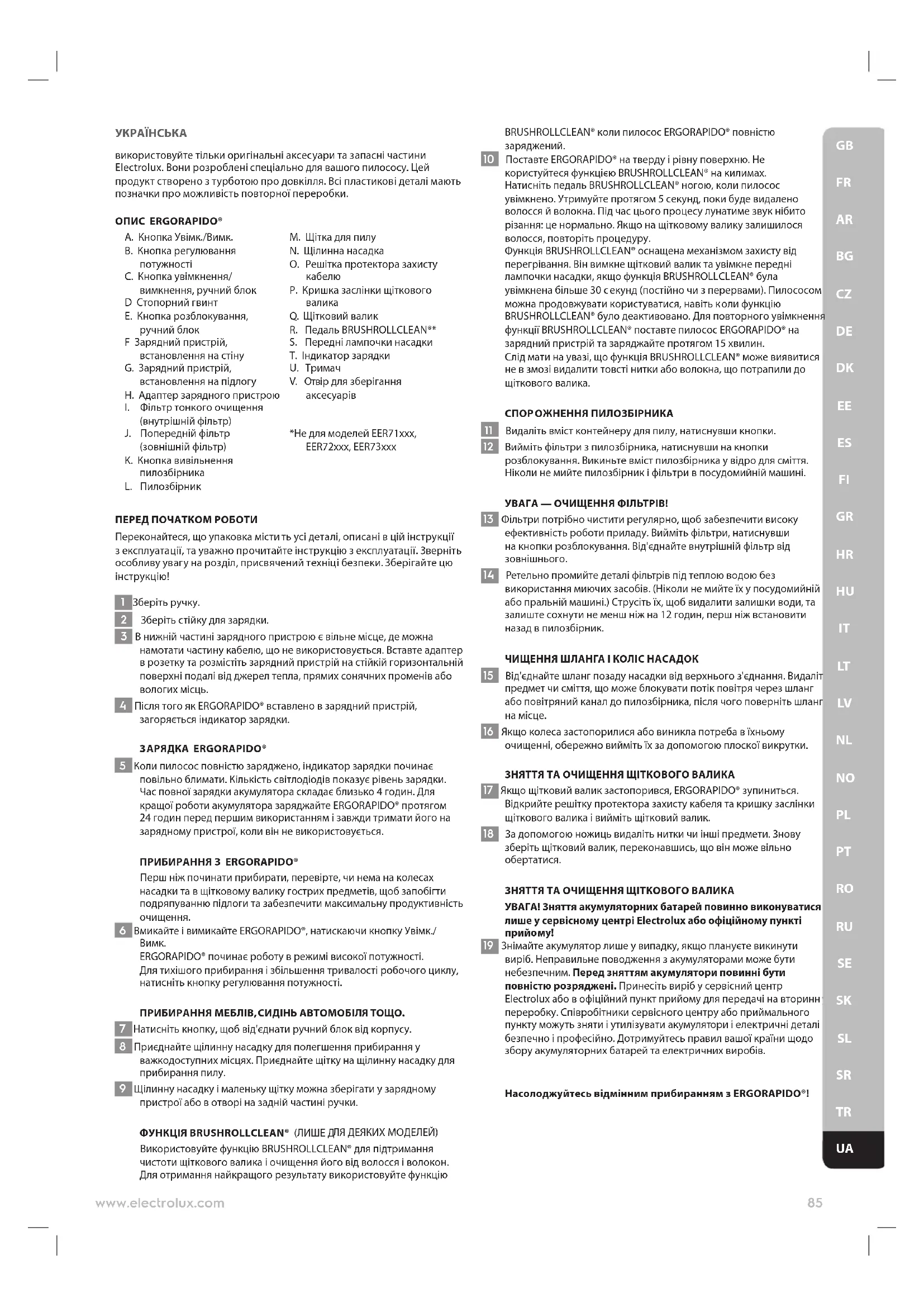 19 Знімайте акумулятор лише у випадку, якщо плануєте викинути виріб. Неправильне поводження з акумуляторами може бути небезпечним. Перед зняттям акумулятори повинні бути повністю розряджені. Принесіть виріб у сервісний центр Electrolux або в офіційний пункт прийому для передачі на вторинну переробку. Співробітники сервісного центру або приймального пункту можуть зняти і утилізувати акумулятори і електричні деталі безпечно і професійно. Дотримуйтесь правил вашої країни щодо збору акумуляторних батарей та електричних виробів. Насолоджуйтесь в ідмінним прибиранням з ERGORAPIDO®! 85www.electrolux.com