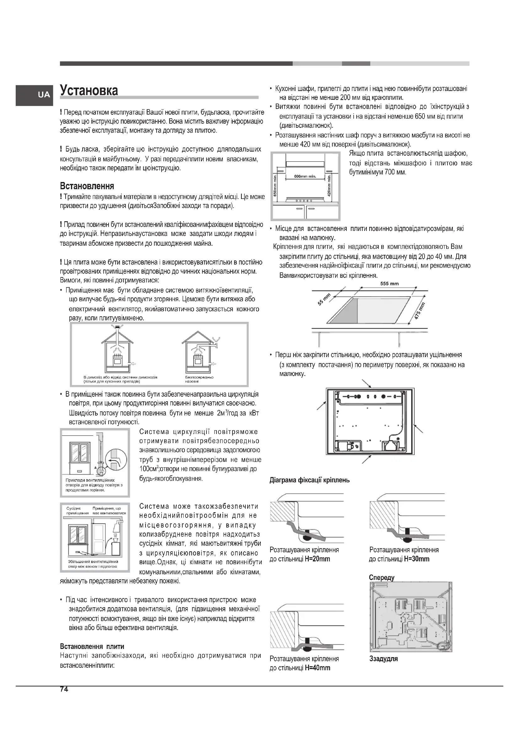 - Пiд чаc інтенсивного і тривалого використання пристрою може знадобитися додаткова вентиляція, (для підвищення механічної потужності всмоктування, якщо він вже існує) наприклад відкриття вікнa або більш ефективнa вентиляція. Встановлення плити Наступні запобіжнізаходи, які необхідно дотримуватися при встановленніплити: