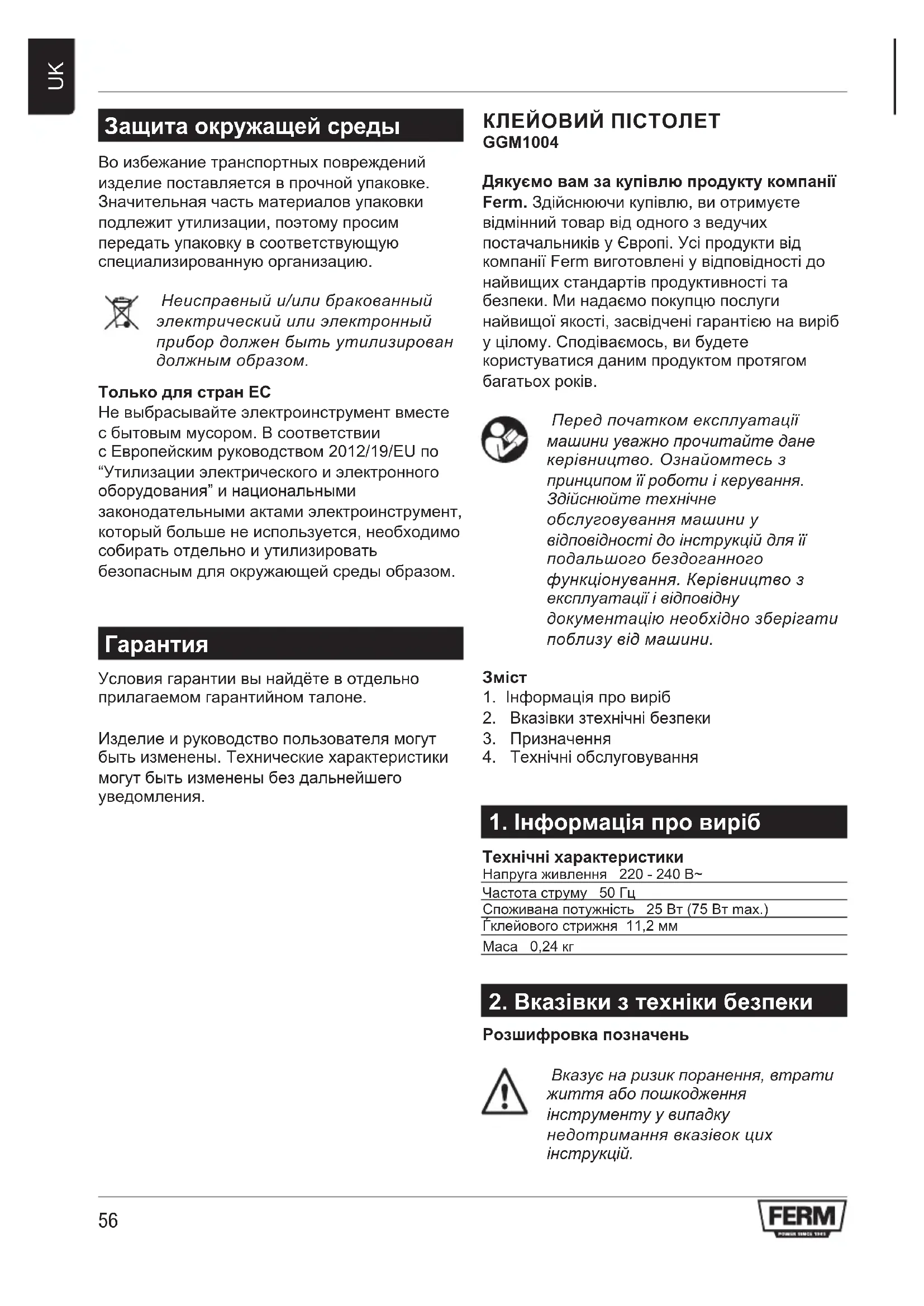Условия гарантии вы найдёте в отдельно прилагаемом гарантийном талоне. Изделие и руководство пользователя могут быть изменены. Технические характеристики могут быть изменены без дальнейшего уведомления. КЛЕЙОВИЙ ПІСТОЛЕТ GGM1004 Дякуємо вам за купівлю продукту компанії Ferm. Здійснюючи купівлю, ви отримуєте відмінний товар від одного з ведучих постачальників у Європі. Усі продукти від компанії Ferm виготовлені у відповідності до найвищих стандартів продуктивності та безпеки. Ми надаємо покупцю послуги найвищої якості, засвідчені гарантією на виріб у цілому. Сподіваємось, ви будете користуватися даним продуктом протягом багатьох років. Передпочаткомексплуатації машиниуважнопрочитайтедане керівництво.Ознайомтесьз принципомїїроботиікерування. Здійснюйтетехнічне обслуговуваннямашиниу відповідностідоінструкційдляїї подальшогобездоганного функціонування.Керівництвоз експлуатаціїівідповідну документаціюнеобхіднозберігати поблизувідмашини.
