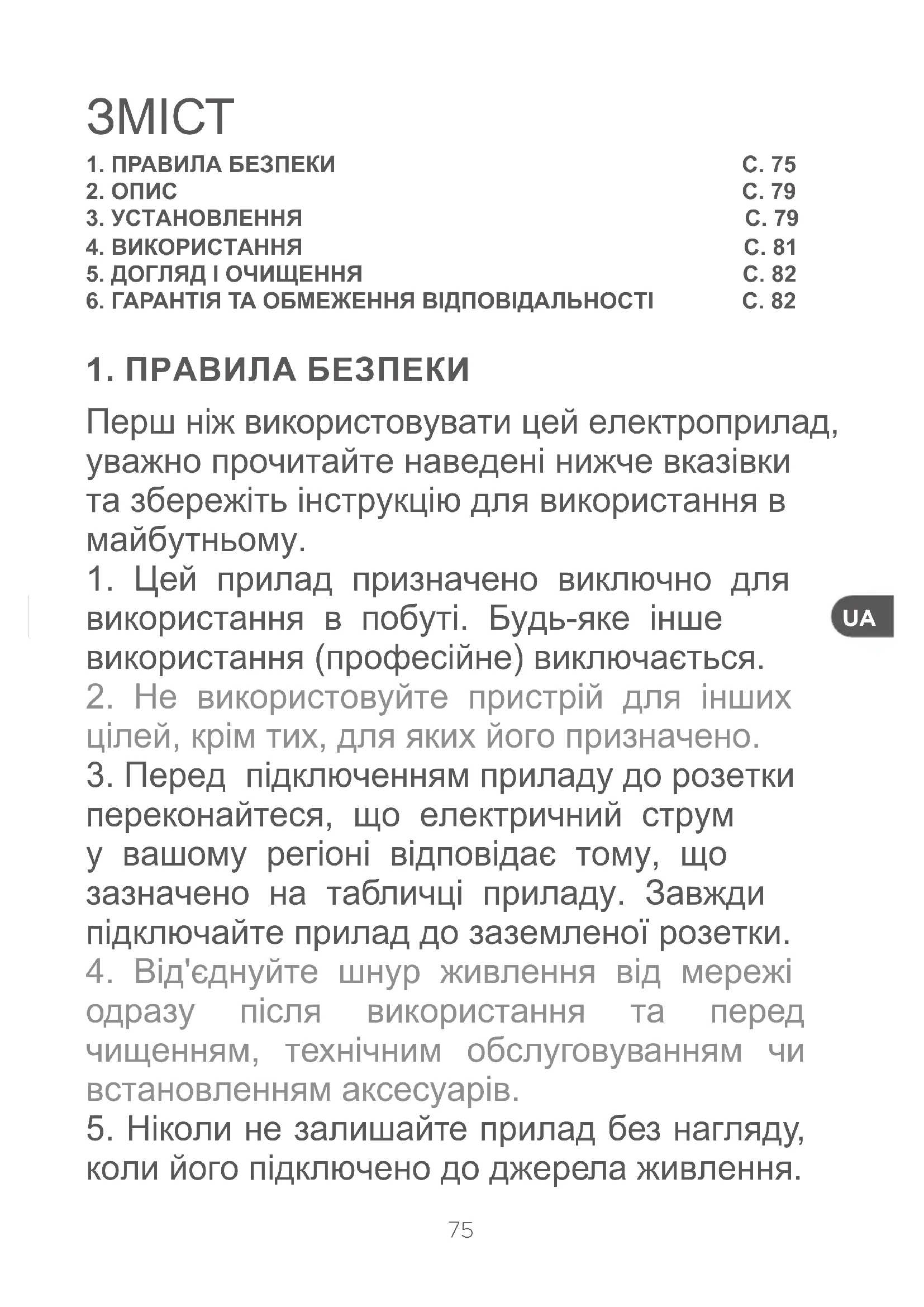 RU1. ПРАВИЛА БЕЗПЕКИ Перш ніж використовувати цей електроприлад, уважно прочитайте наведені нижче вказівки та збережіть інструкцію для використання в майбутньому.